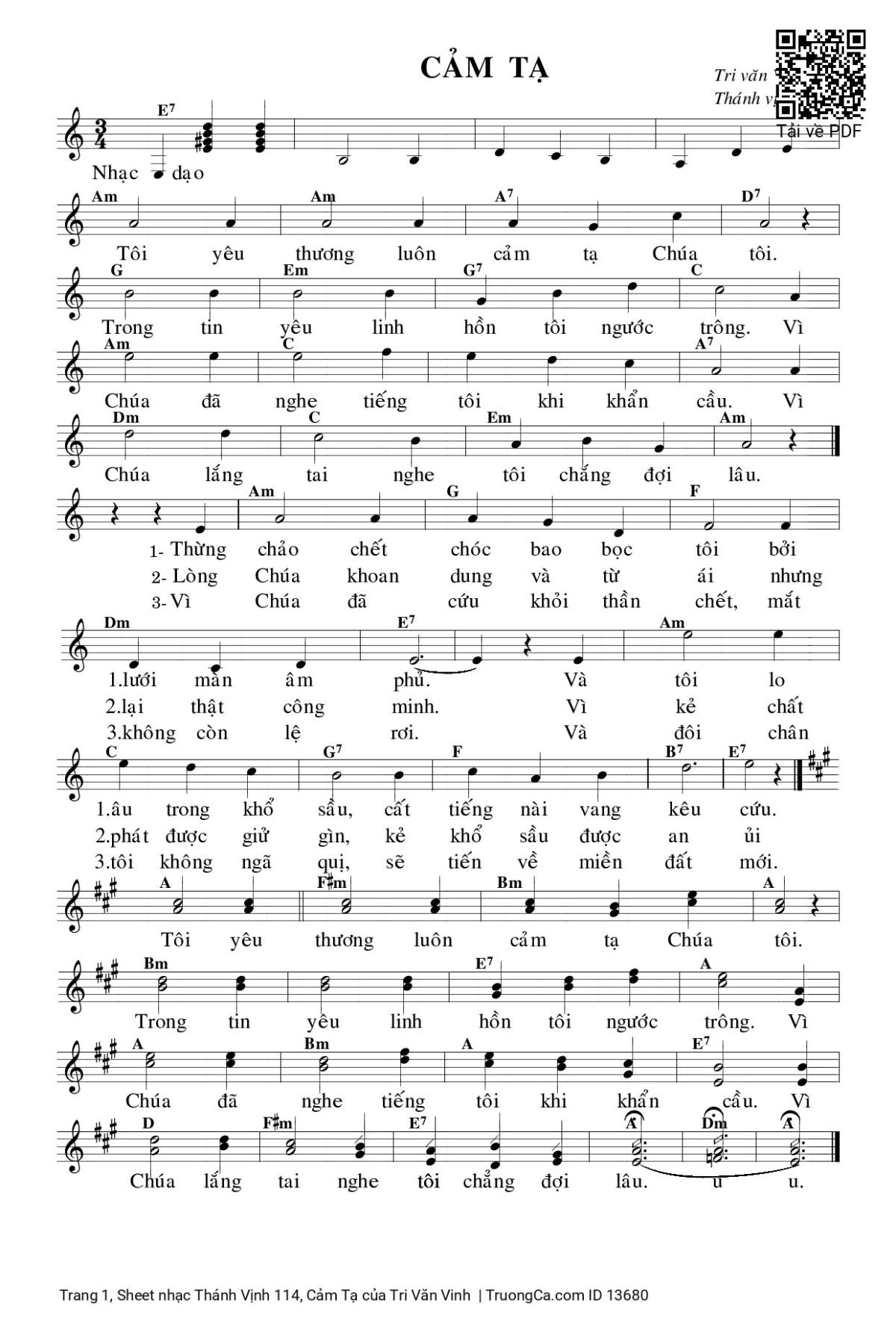 The Videos/audios Thánh Vịnh 114, Cảm Tạ by Tri Văn Vinh were embed from Youtube, Musescore or the other 3rd links. Videos are subject to 3rd's copyright control and may be removed by YouTube's copyright rules and 3rd's policies or maybe included advertisements. If you cannot access to these songs, this mean that have been removed.
