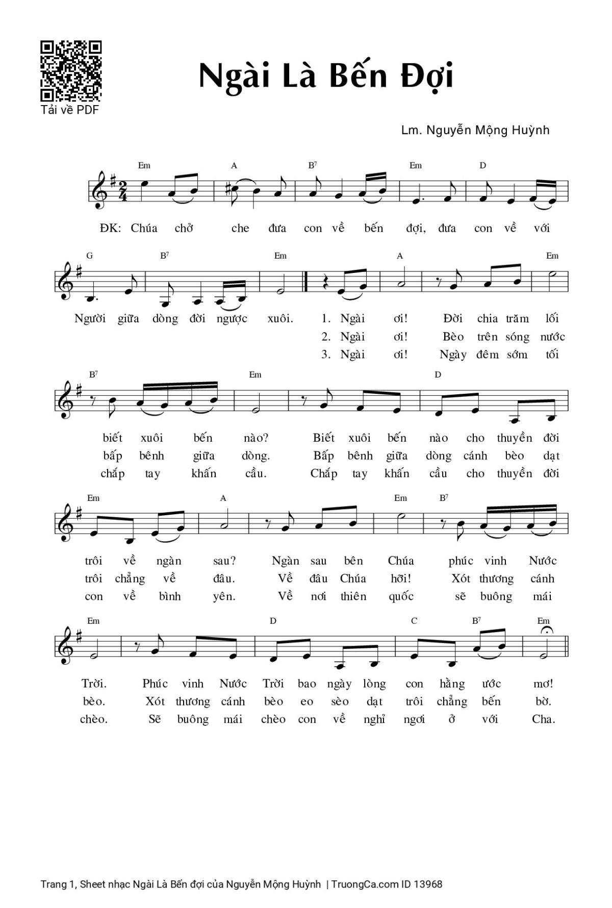Transposition is the process of moving a song's melody and chords up or down in pitch by a constant interval. The direction of the transposition tool is indicated by a plus (+) sign for up and a minus (-) sign for down. Hover mouse over chords signs to see the chords chart of Ngài Là Bến đợi song.