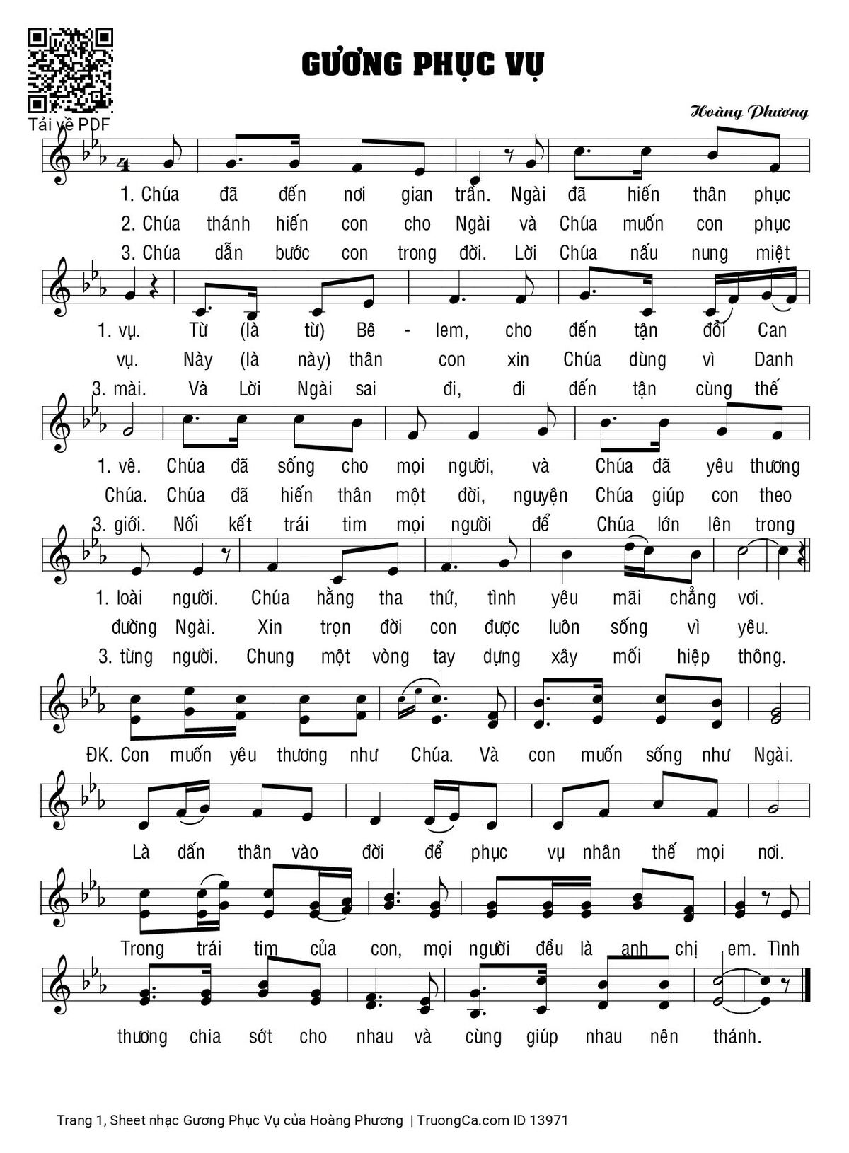 The Videos/audios Gương Phục Vụ by Hoàng Phương were embed from Youtube, Musescore or the other 3rd links. Videos are subject to 3rd's copyright control and may be removed by YouTube's copyright rules and 3rd's policies or maybe included advertisements. If you cannot access to these songs, this mean that have been removed.