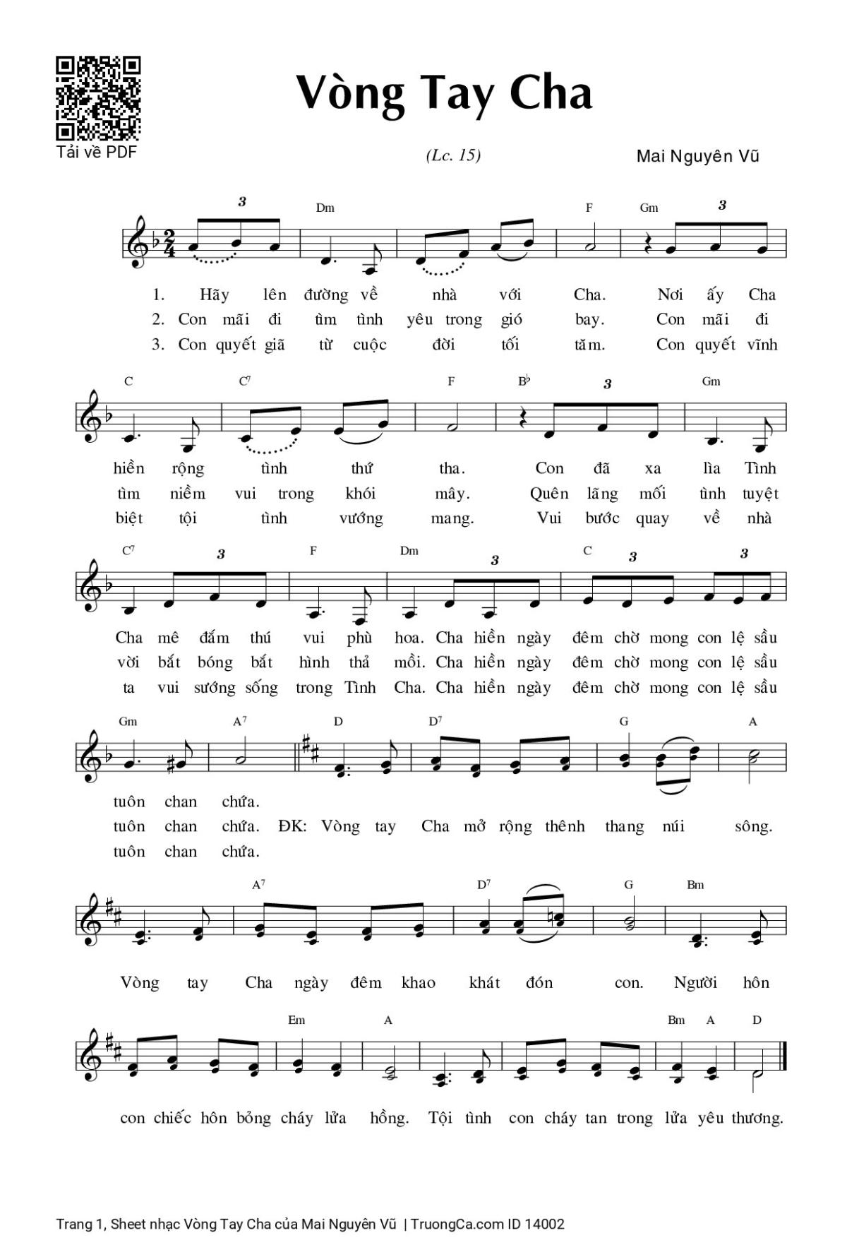 Transposition is the process of moving a song's melody and chords up or down in pitch by a constant interval. The direction of the transposition tool is indicated by a plus (+) sign for up and a minus (-) sign for down. Hover mouse over chords signs to see the chords chart of Vòng Tay Cha song.