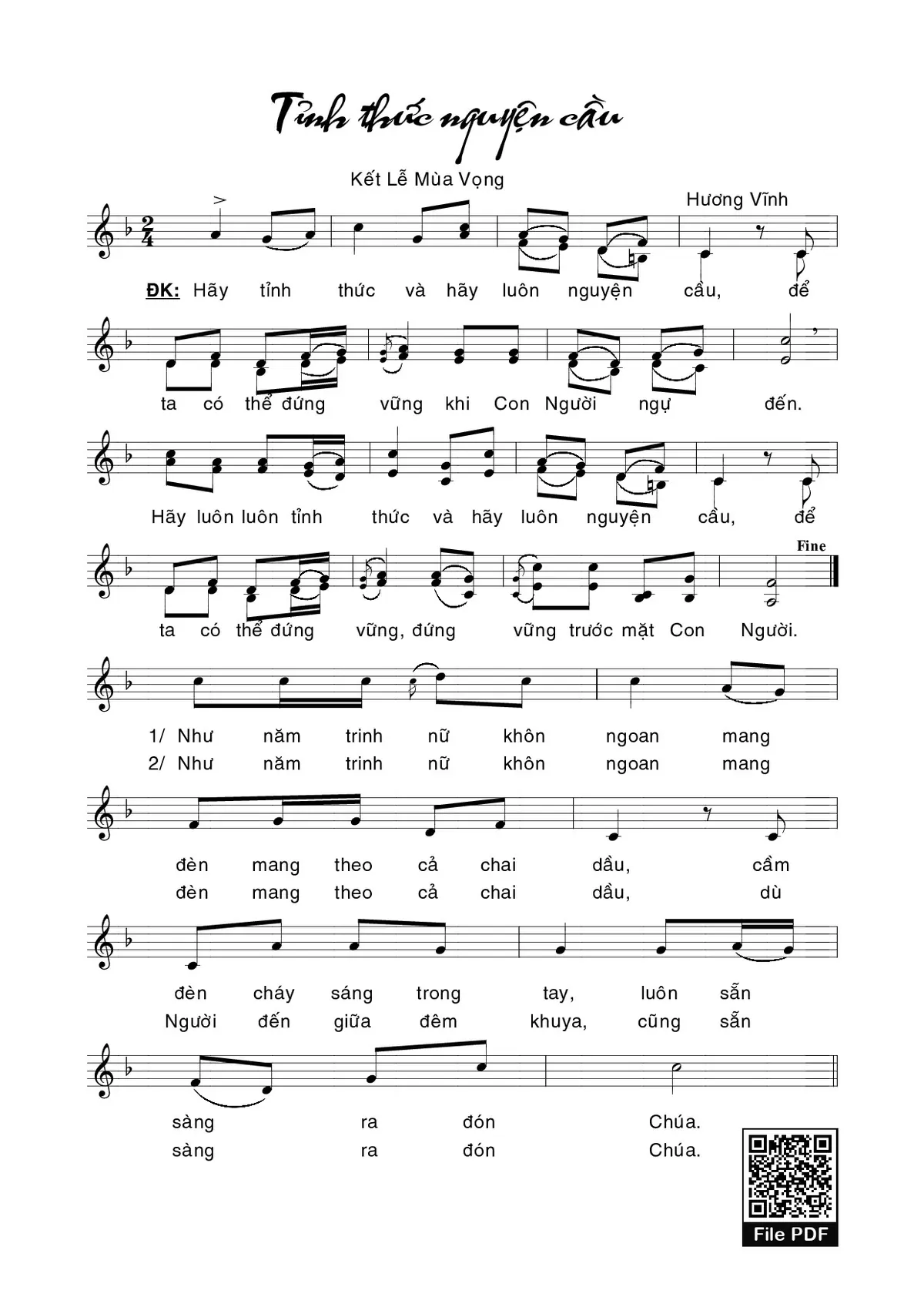 Điệp khúc. Hãy tỉnh thức và hãy luôn nguyện cầu, để ta có thể đứng vững khi Con Người ngự đến. Hãy luôn luôn tỉnh thức và hãy luôn nguyện cầu, để ta có thể đứng vững, đứng vững trước mặt Con Người.