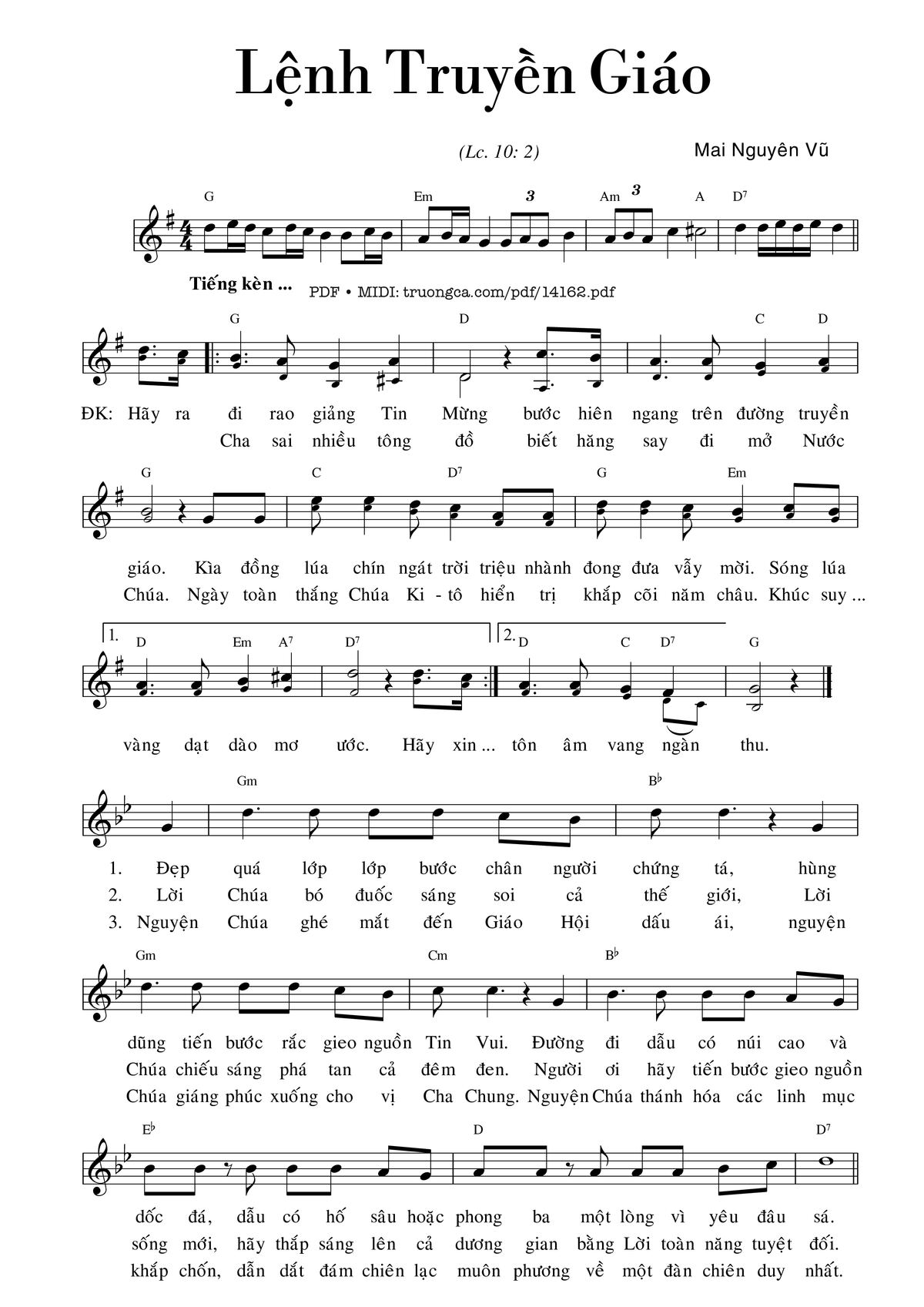 Điệp khúc. Hãy ra đi rao giảng Tin Mừng, bước hiên ngang trên đường truyền giáo. Kìa đồng lúa chín ngát trời triệu nhành đong đưa vẫy mời. Sóng lúa vàng dạt dào mơ ước. Hãy xin Cha sai nhiều tông đồ, biết hăng say đi mở Nước Chúa. Ngày toàn thắng Chúa Ki-tô hiển trị khắp cõi năm châu. Khúc suy tôn âm vang ngàn thu.