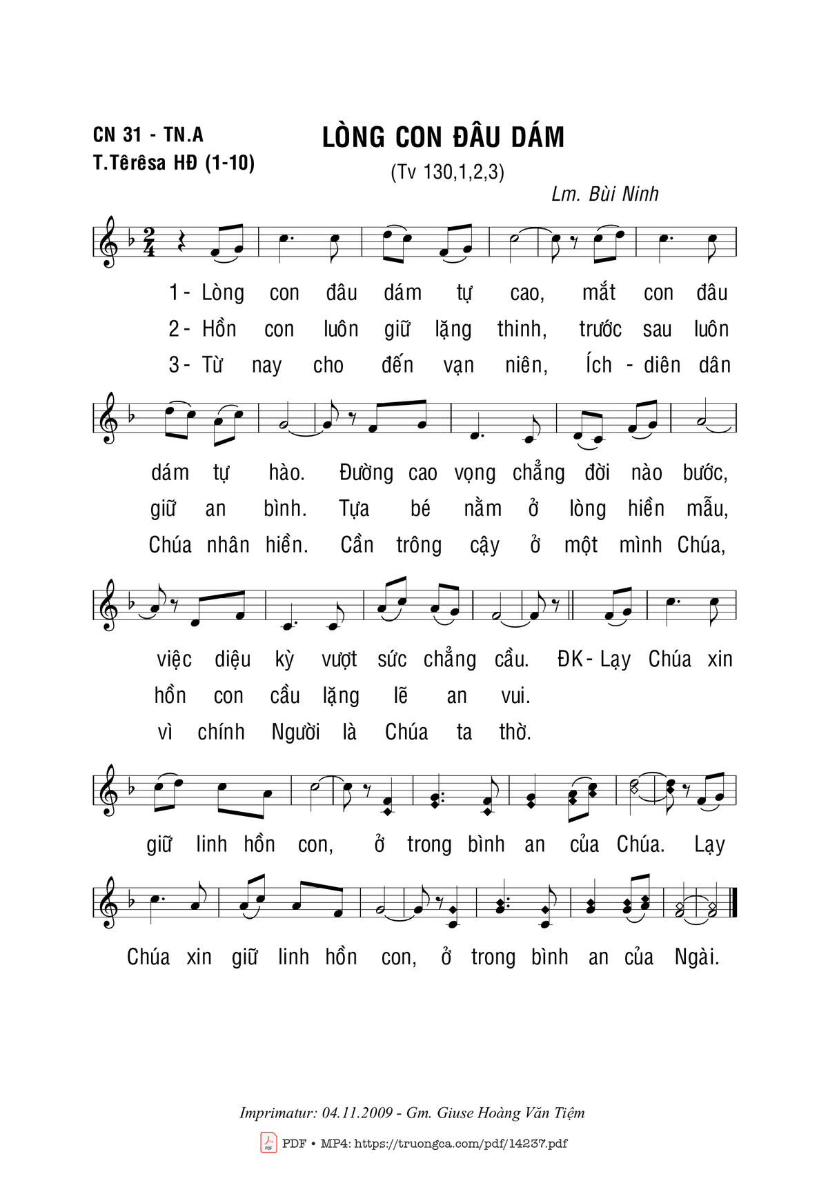 The Videos/audios Thánh Vịnh 130, Lòng Con đâu Dám by Bùi Ninh were embed from Youtube, Musescore or the other 3rd links. Videos are subject to 3rd's copyright control and may be removed by YouTube's copyright rules and 3rd's policies or maybe included advertisements. If you cannot access to these songs, this mean that have been removed.
