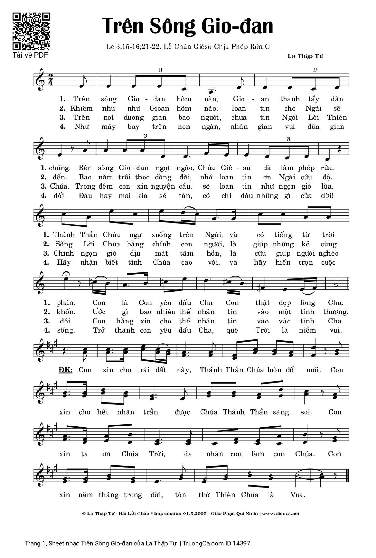 1. Trên sông Gio-đan hôm nào, Gio-an thanh tẩy dân chúng. Bên sông Gio-đan ngọt ngào, Chúa Giê-su đã làm phép rửa. Thánh Thần Chúa ngự xuống trên Ngài, và có tiếng từ trời phán: Con là Con yêu dấu Cha Con thật đẹp lòng Cha.