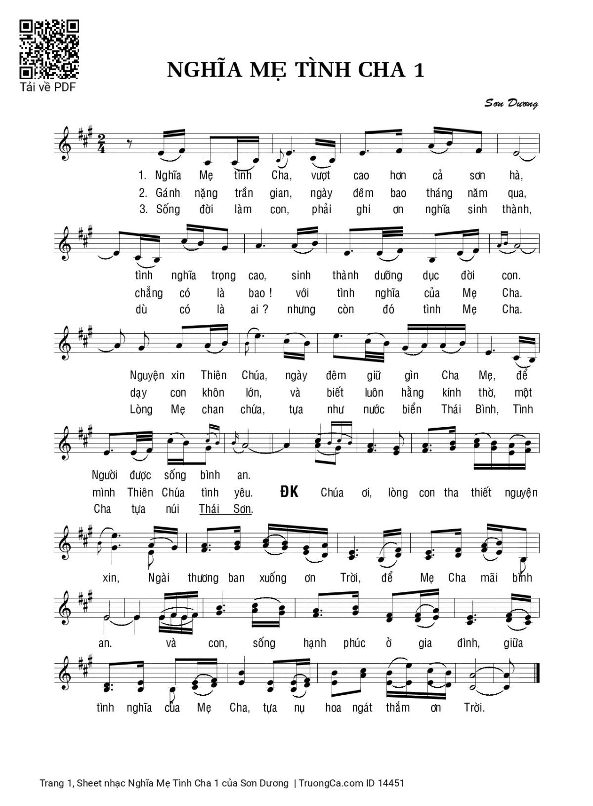 1. Nghĩa Mẹ tình Cha, vượt cao hơn cả sơn hà, tình nghĩa trọng cao, sinh thành dưỡng dục đời con. Nguyện xin Thiên Chúa, ngày đêm giữ gìn Cha Mẹ, để Người được sống bình an.