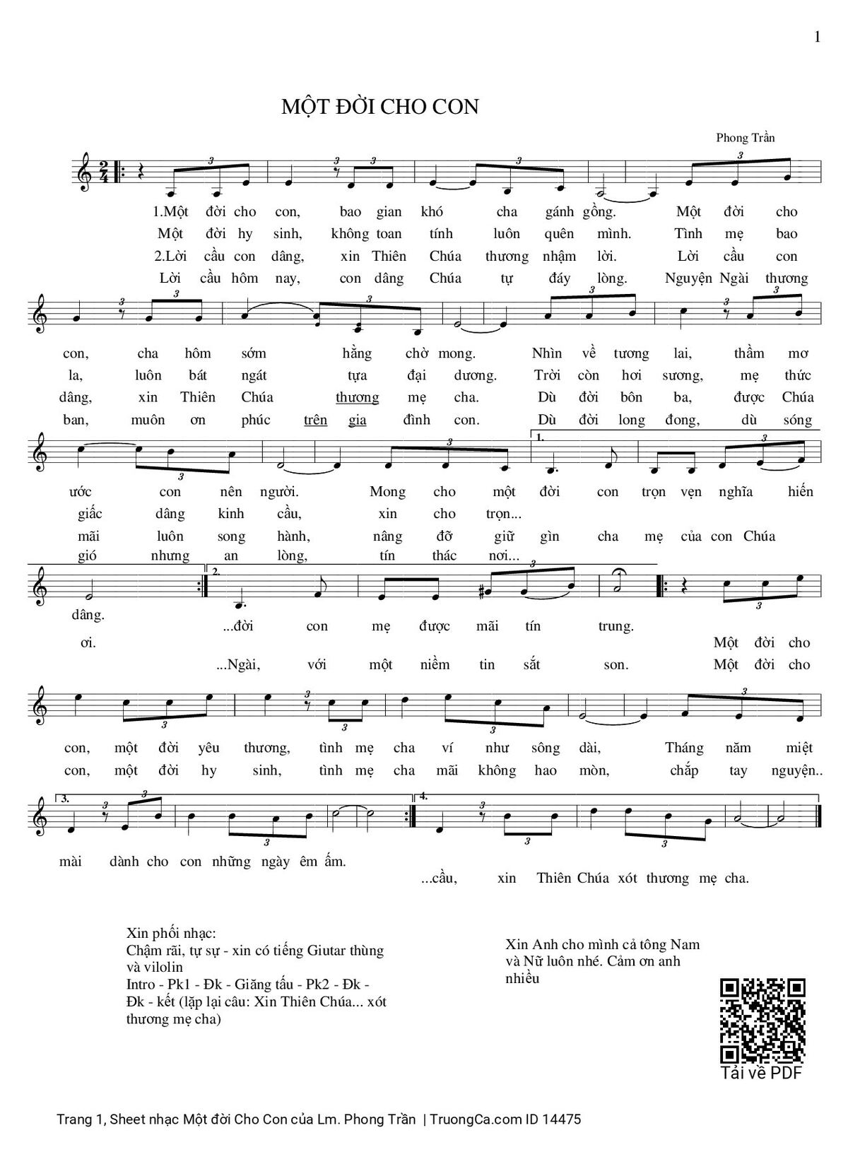 1. Một đời cho con, bao gian khó cha gánh gồng. Một đời cho con, cha hôm sớm hằng chờ mong. Nhìn về tương lai, thầm mơ ước con nên người. Mong cho một đời con trọn vẹn nghĩa hiến dâng. Một đời hy sinh, không toan tính luôn quên mình. Tình mẹ bao la, luôn bát ngát tựa đại dương. Trời còn hơi sương, mẹ thức giấc dâng kinh cầu. Xin cho trọn đời, con mẹ được mãi tín trung.