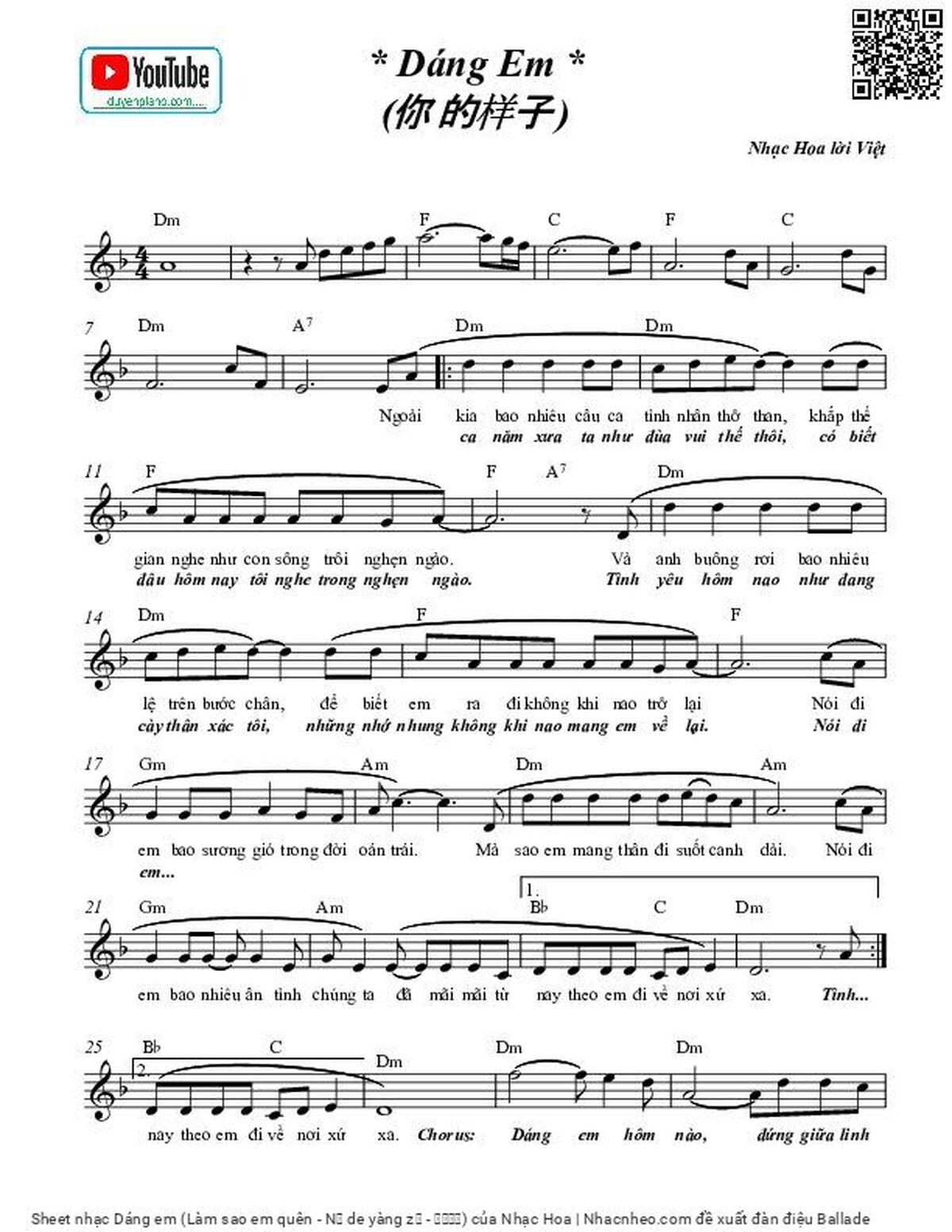 Nhạc Hoa Phiên bản Dáng em lời Việt Nguyễn Văn Thanh Nhã [PDF] [Sheet] [Lyrics] [Mp4/Midi]