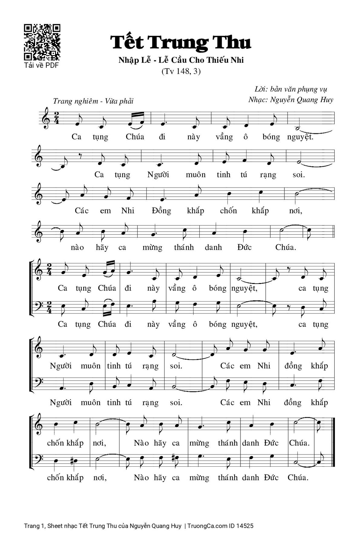 Ca tụng Chúa đi này vầng ô bóng nguyệt. Ca tụng Người muôn tinh tú rạng soi. Các em Nhi Đồng khắp chốn khắp nơi, nào hãy ca mừng thánh danh Đức Chúa