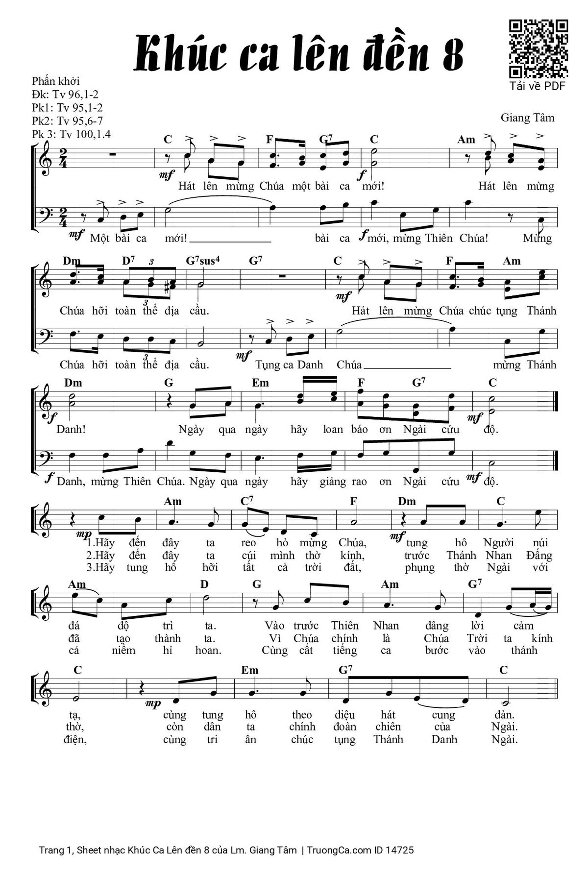 3/ Hãy tung hô hỡi tất cả trời đất, phụng thờ Ngài với cả niềm hỷ hoan. Cùng cất tiếng ca bước vào thánh điện, cùng tri ân chúc tụng Thánh Danh Ngài.