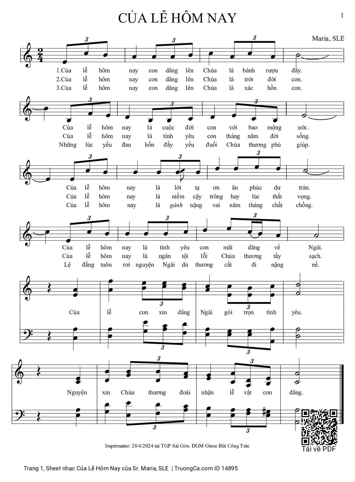 1. Của lễ hôm nay con dâng lên Chúa là bánh rượu đây. Của lễ hôm nay là cuộc đời con với bao mộng ước. Của lễ hôm nay là lời tạ ơn ân phúc dư tràn. Của lễ hôm nay là tình yêu con mãi dâng về Ngài.