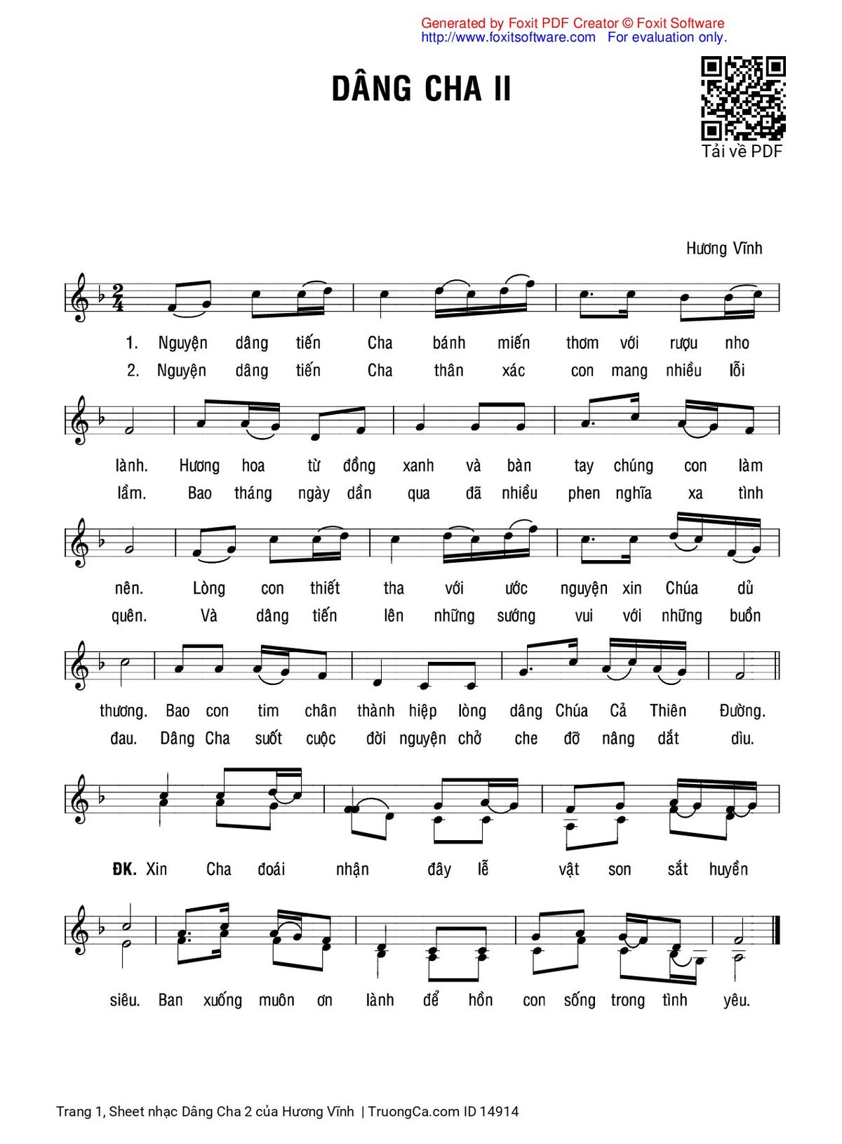 Transposition is the process of moving a song's melody and chords up or down in pitch by a constant interval. The direction of the transposition tool is indicated by a plus (+) sign for up and a minus (-) sign for down. Hover mouse over chords signs to see the chords chart of Dâng Cha 2 song.