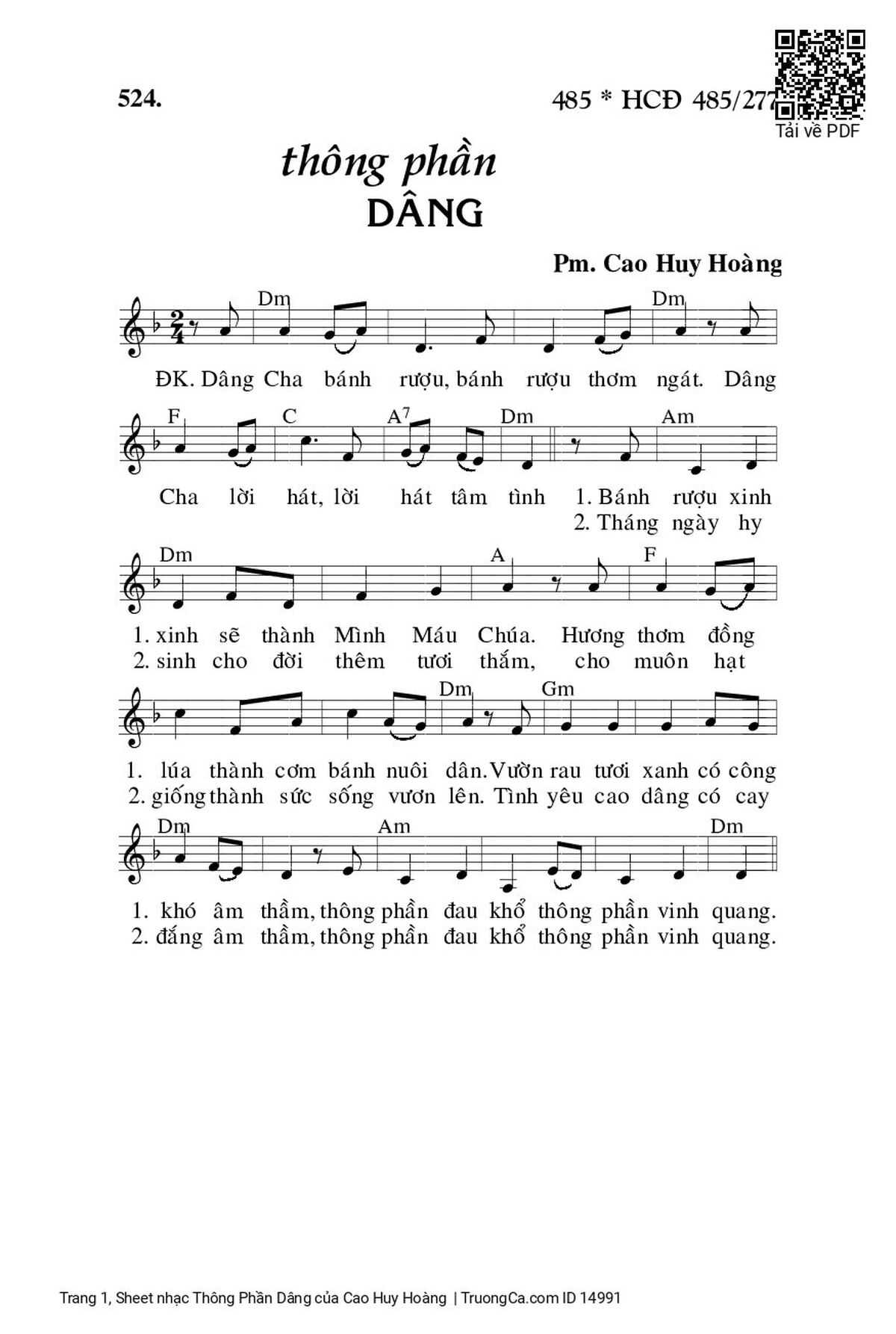 1. Bánh rượu xinh xinh sẽ thành Mình Máu Chúa. Hương thơm đồng lúa thành cơm bánh nuôi dân. Vườn rau tươi xanh có công khó âm thầm. Thông phần đau khổ thông phần vinh quang.