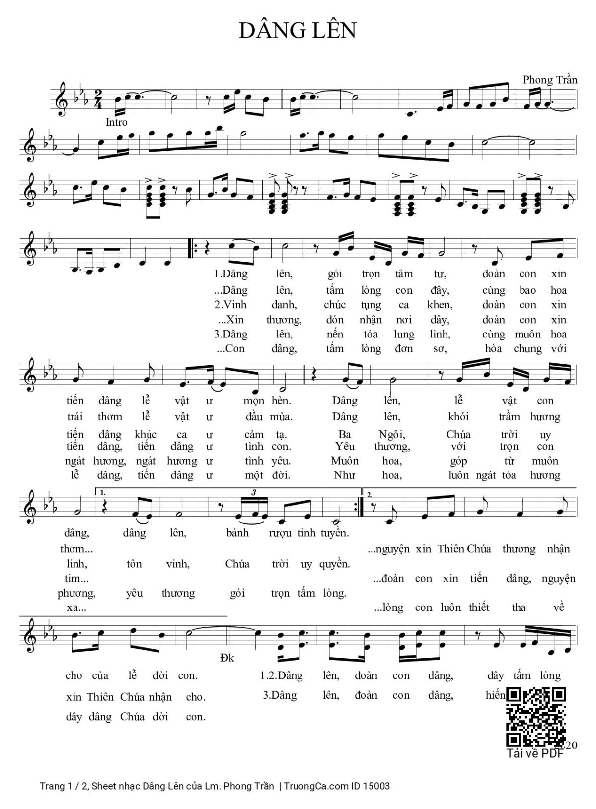 Điệp khúc1. Dâng lên, đoàn con dâng , đây taám lòng thành. Đây tấm lòng con nguyện dâng lên. Chúc tụng ngợi khen tôn vinh Thiên Chúa. Dâng lên, này hương hoa bát ngát ruộng đồng. Xin Chúa nhận cho lễ dâng cuộc đời. Xin Chúa nhận cho lễ vật con dâng.