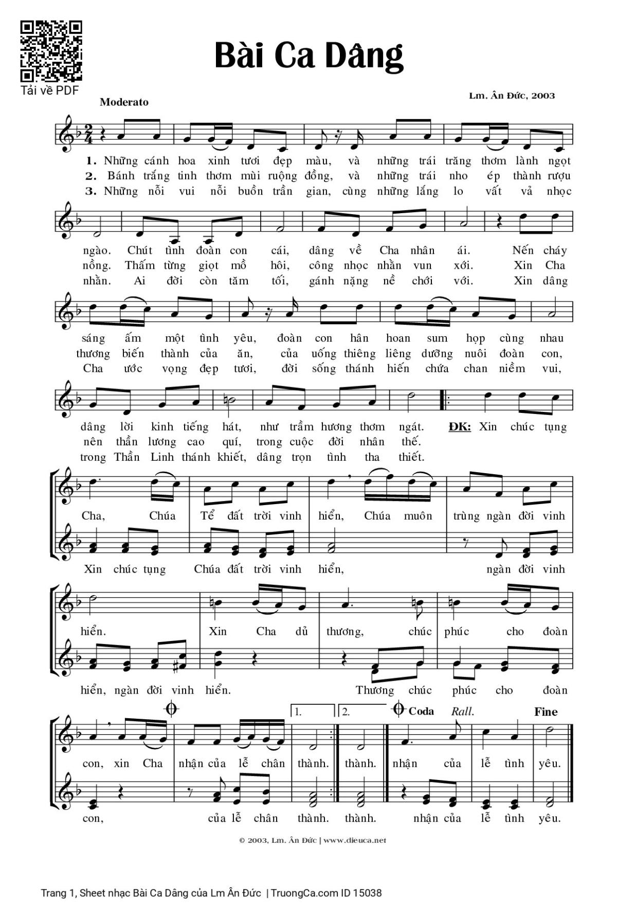 Điệp khúc: Xin chúc tụng Cha, Chúa Tể đất trời vinh hiển, Chúa muôn trùng ngàn đời vinh hiển. Xin Cha dủ thương, chúc phúc cho đoàn con, xin Cha nhận của lễ chân thành. Coda: Xin chúc tụng Cha, Chúa Tể đất trời vinh hiển, Chúa muôn trùng ngàn đời vinh hiển. Xin Cha dủ thương, chúc phúc cho đoàn con, xin Cha nhận của lễ tình yêu.