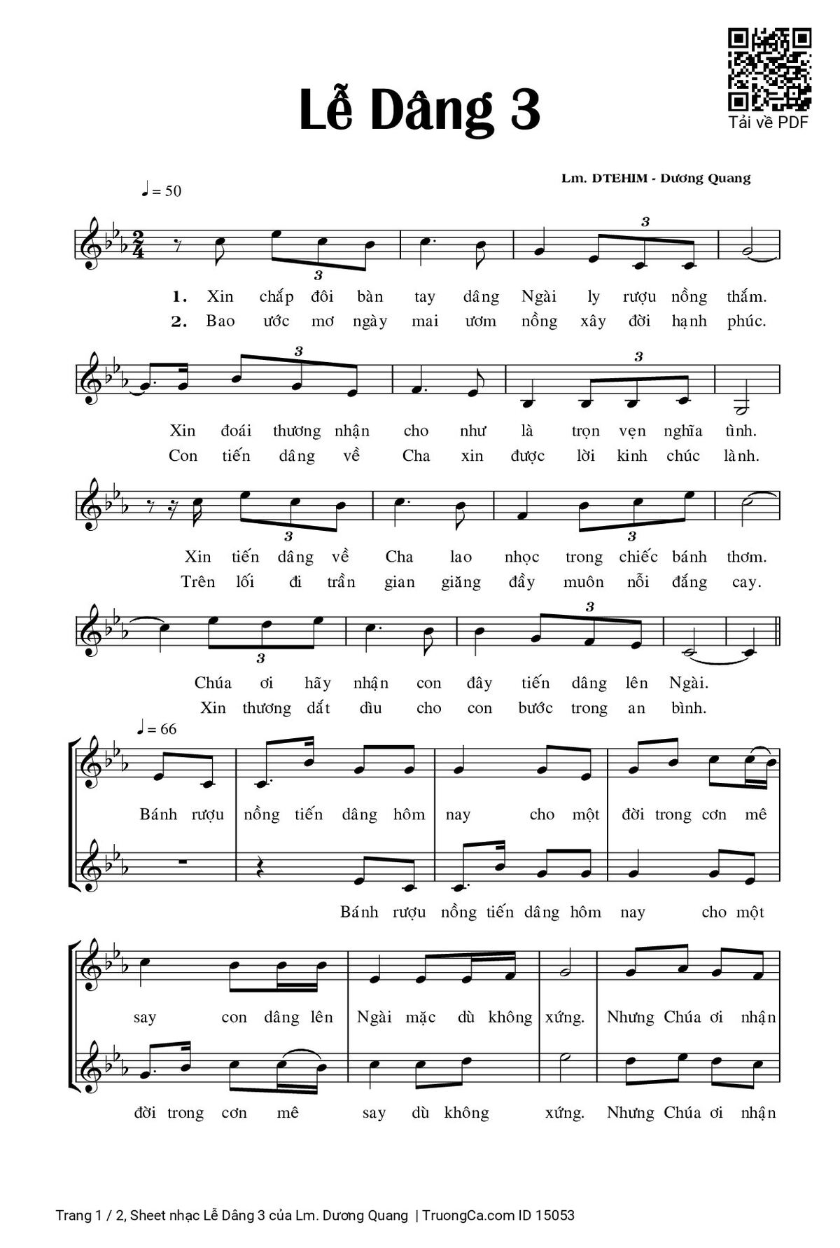 Transposition is the process of moving a song's melody and chords up or down in pitch by a constant interval. The direction of the transposition tool is indicated by a plus (+) sign for up and a minus (-) sign for down. Hover mouse over chords signs to see the chords chart of Lễ Dâng 3 song.