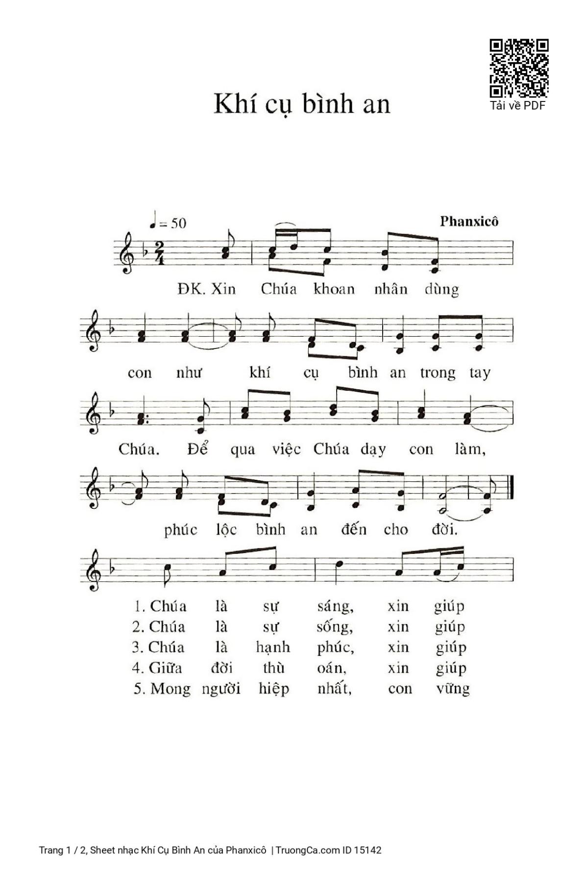 Điệp khúc. Xin Chúa khoan nhân dùng con như khí cụ bình an trong tay Chúa. Để qua việc Chúa dạy con làm, phúc lộc bình an đến cho đời.
