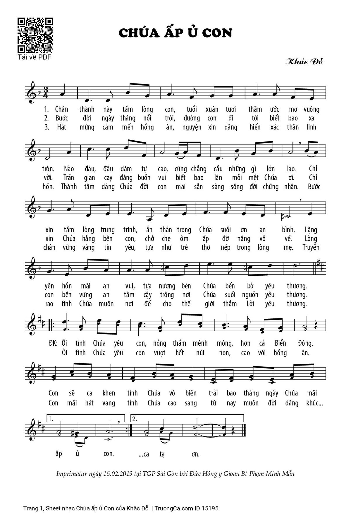 Transposition is the process of moving a song's melody and chords up or down in pitch by a constant interval. The direction of the transposition tool is indicated by a plus (+) sign for up and a minus (-) sign for down. Hover mouse over chords signs to see the chords chart of Chúa ấp ủ Con song.