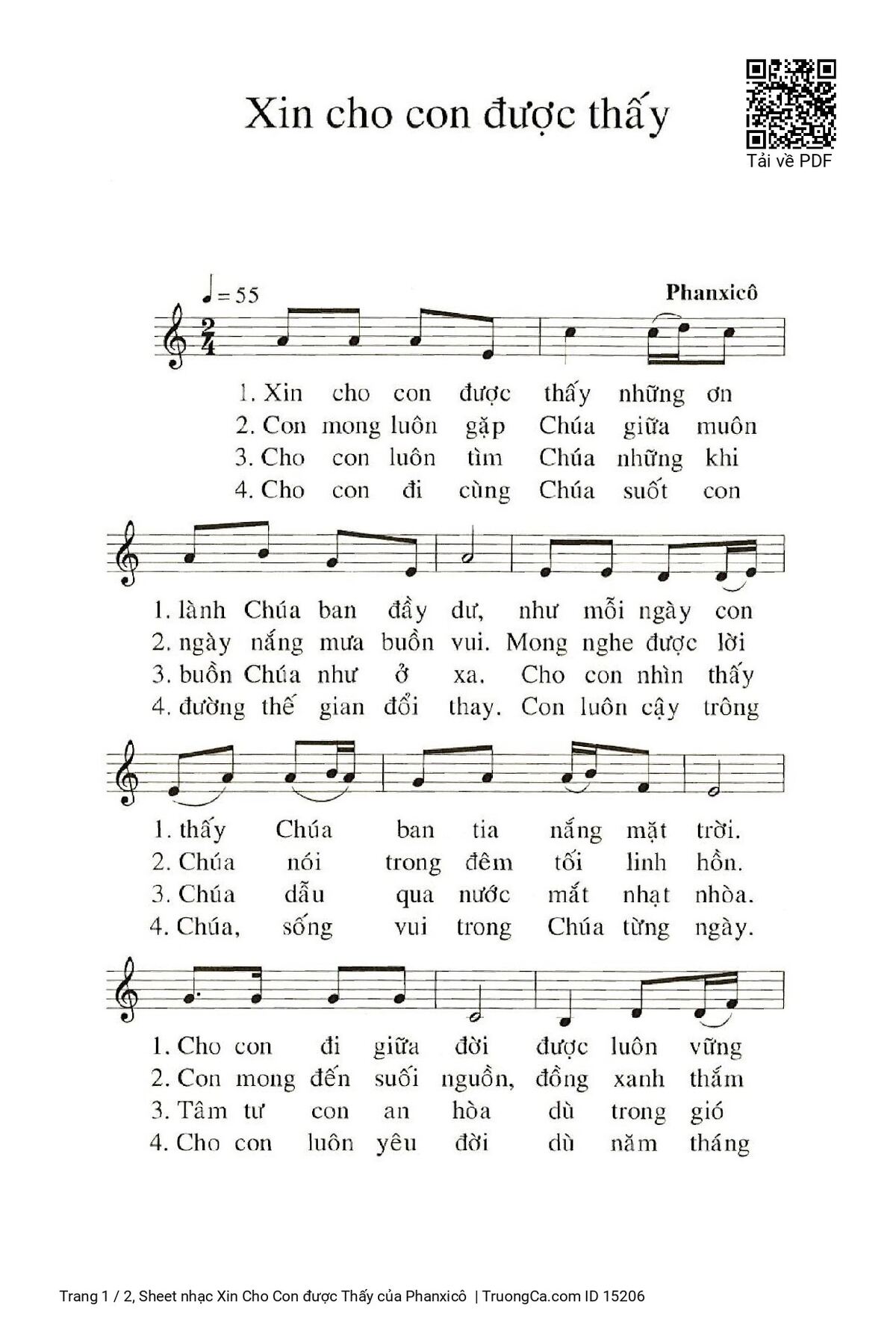 1. Xin cho con được thấy những ơn lành Chúa ban đầy dư, như mỗi ngày con thấy Chúa ban tia nắng mặt trời. Cho con đi giữa đời được luôn vững tin, con được luôn vững tin và luôn khấn xin ơn trời.