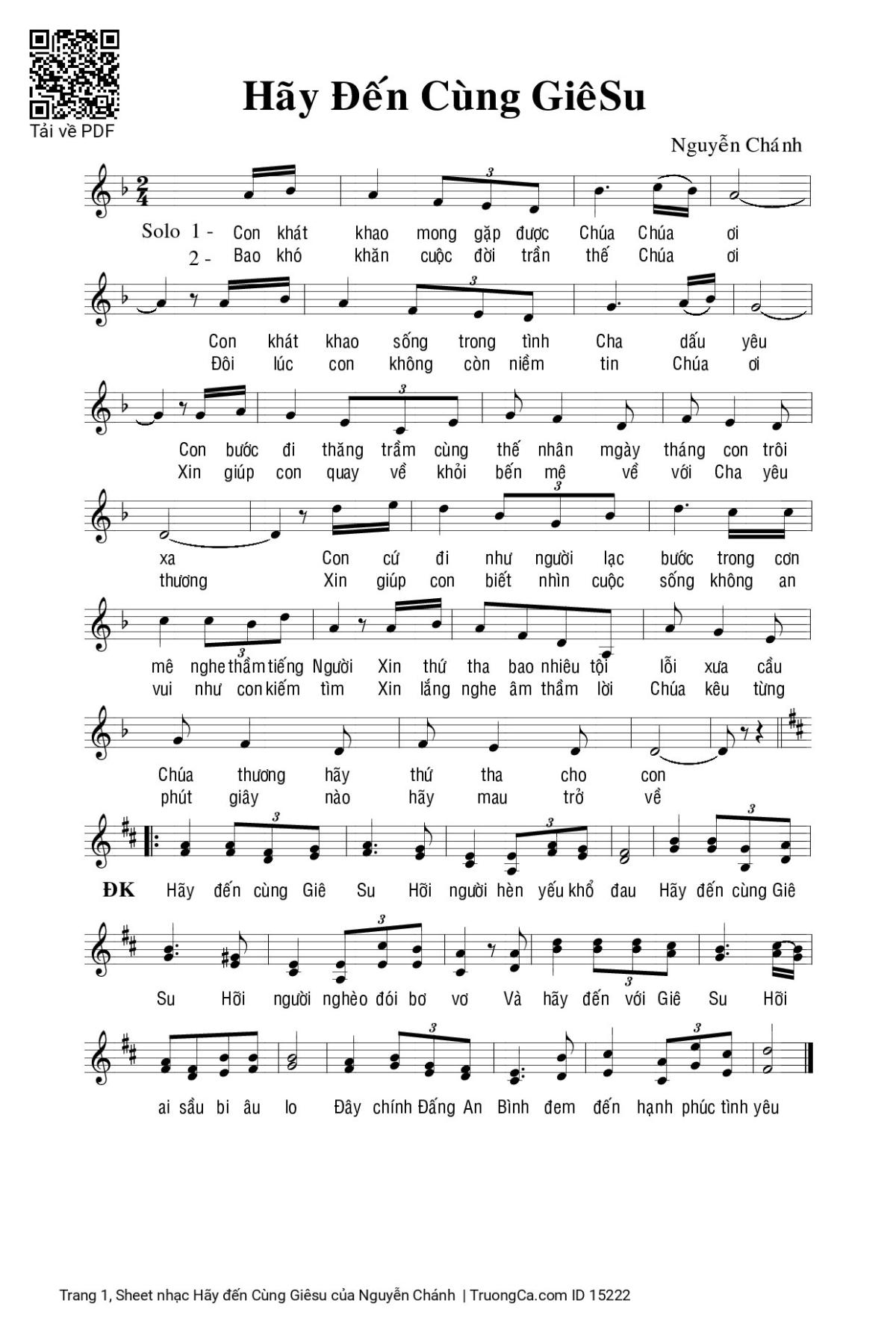 Transposition is the process of moving a song's melody and chords up or down in pitch by a constant interval. The direction of the transposition tool is indicated by a plus (+) sign for up and a minus (-) sign for down. Hover mouse over chords signs to see the chords chart of Hãy đến Cùng Giêsu song.