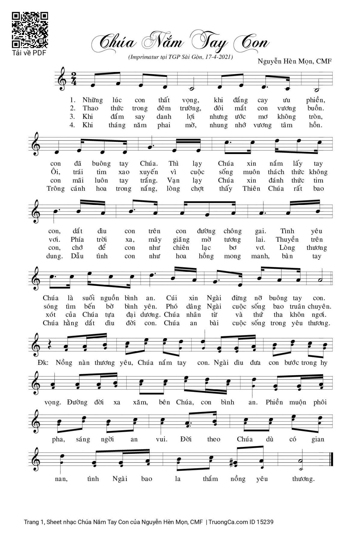 1/ Những lúc con thất vọng, khi đắng cay ưu phiền, con đã buông tay Chúa. Thì lạy Chúa xin nắm lấy tay con, dắt dìu con trên con đường chông gai. Tình yêu Chúa là suối nguồn bình an. Cúi xin Ngài đừng nỡ buông tay con.