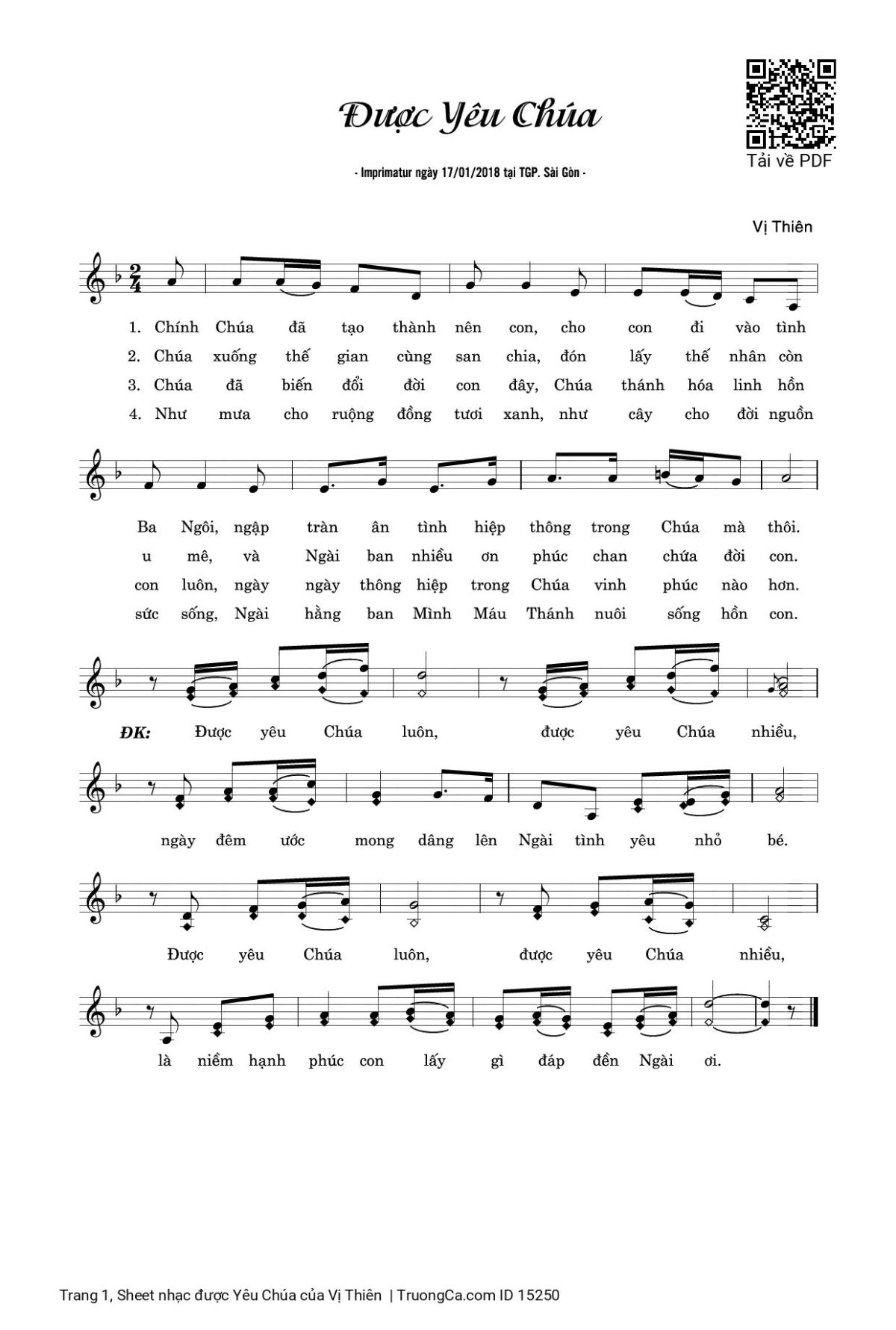 Điệp khúc. Được yêu Chúa luôn, được yêu Chúa nhiều, ngày đêm ước mong dâng lên Ngài tình yêu nhỏ bé. Được yêu Chúa luôn, được yêu Chúa nhiều, là niềm hạnh phúc con lấy gì đáp đền Ngài ơi.