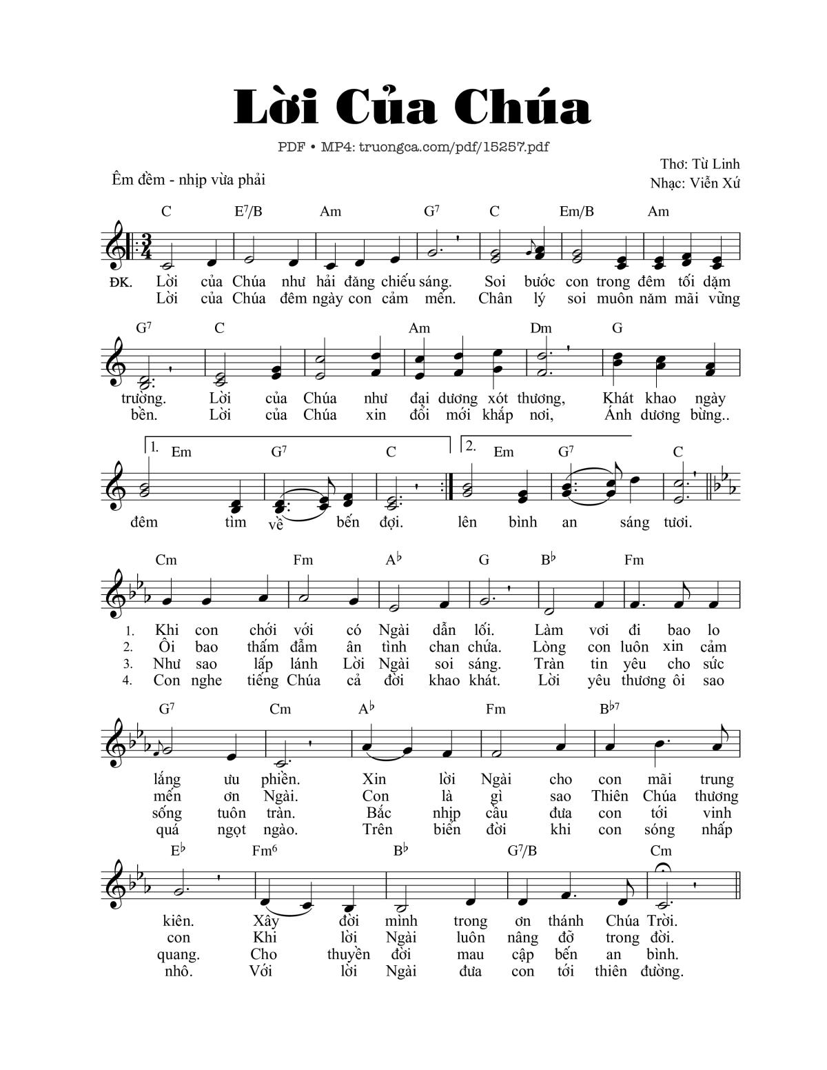 Transposition is the process of moving a song's melody and chords up or down in pitch by a constant interval. The direction of the transposition tool is indicated by a plus (+) sign for up and a minus (-) sign for down. Hover mouse over chords signs to see the chords chart of Lời Của Chúa song.