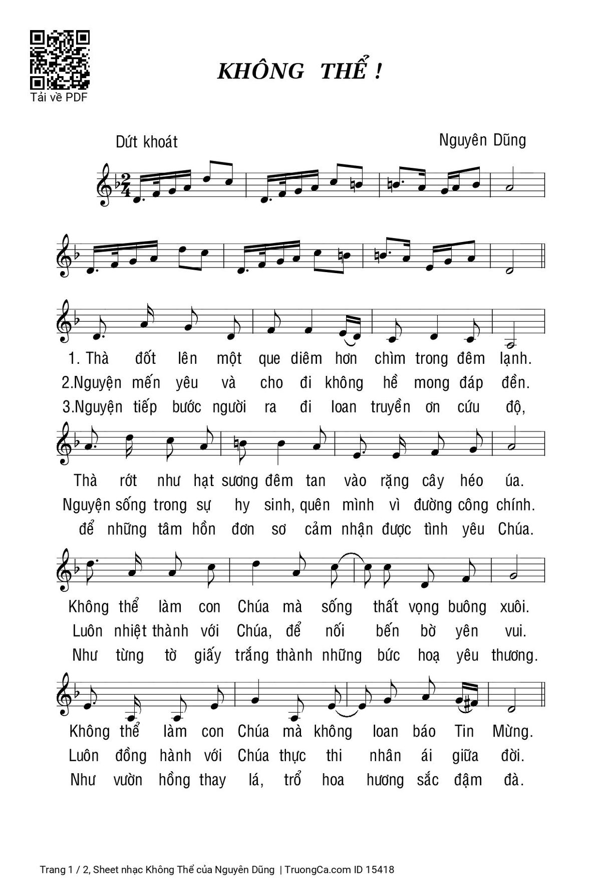 1. Thà đốt lên một que diêm hơn chìm trong đêm lạnh. Thà rớt như hạt sương đêm tan vào rặng cây héo úa. Không thể làm con Chúa mà sống thất vọng buông xuôi. Không thể làm con Chúa mà không loan báo Tin Mừng