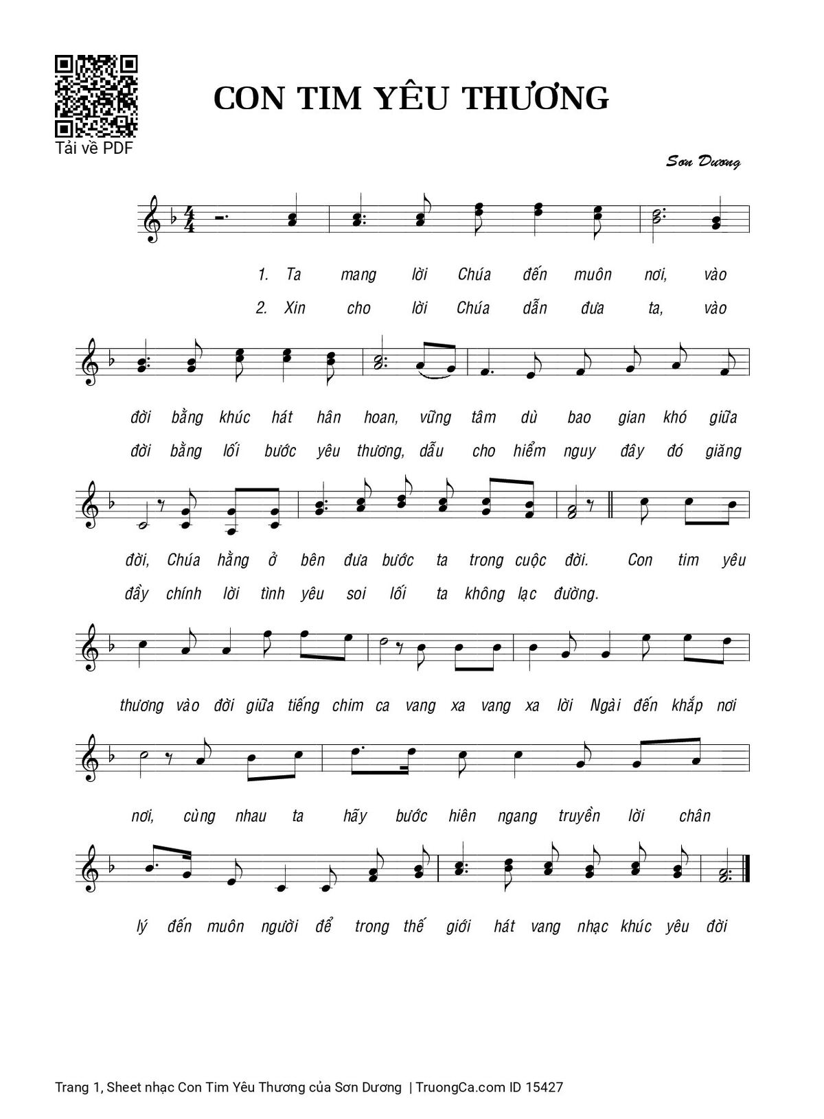 Điệp khúc. Con tim yêu thương vào đời giữa tiếng chim ca, vang xa vang xa lời Ngài đến khắp nơi nơi, cùng nhau ta hãy bước hiên ngang, truyền lời chân lý đến muôn người, để trong thế giới hát vang nhạc khúc yêu đời.