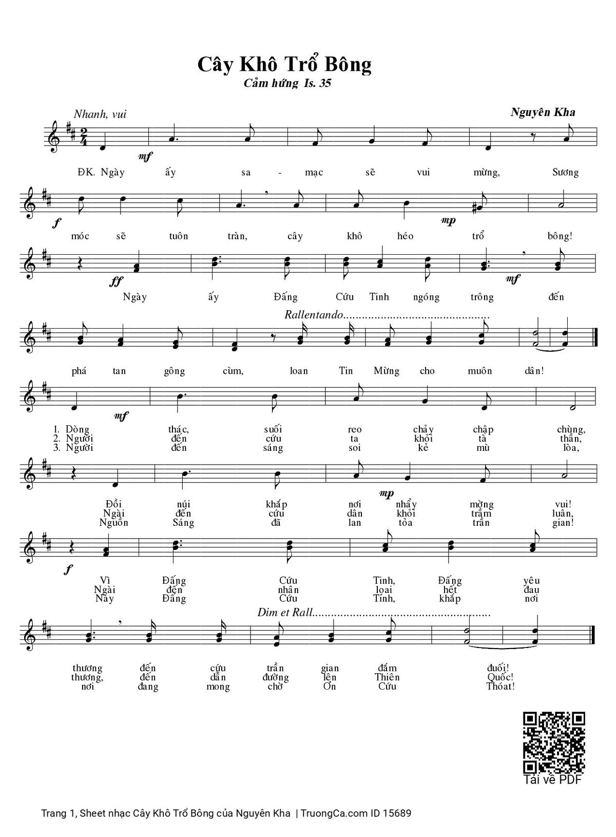 Điệp khúc. Ngày ấy sa mạc sẽ vui mừng, Sương móc sẽ tuôn tràn, cây khô héo trổ bông! Ngày ấy Đấng Cứu Tinh ngóng trông đến phá tan gông cùm, loan Tin Mừng cho muôn dân!