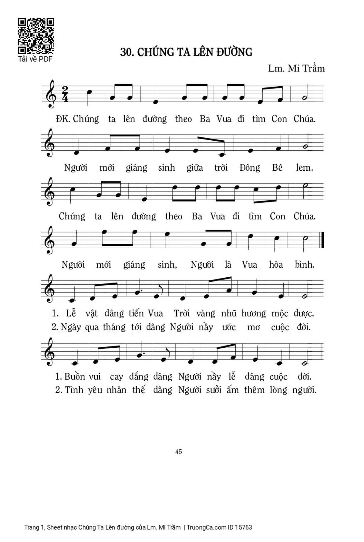 Điệp khúc. Chúng ta lên đường theo ba vua đi tìm Con Chúa, Người mới giáng sinh giữa trời đông Bêlem. Chúng ta lên đường theo ba vua đi tìm Con Chúa, Người mới giáng sinh, Người là Vua hoà bình.