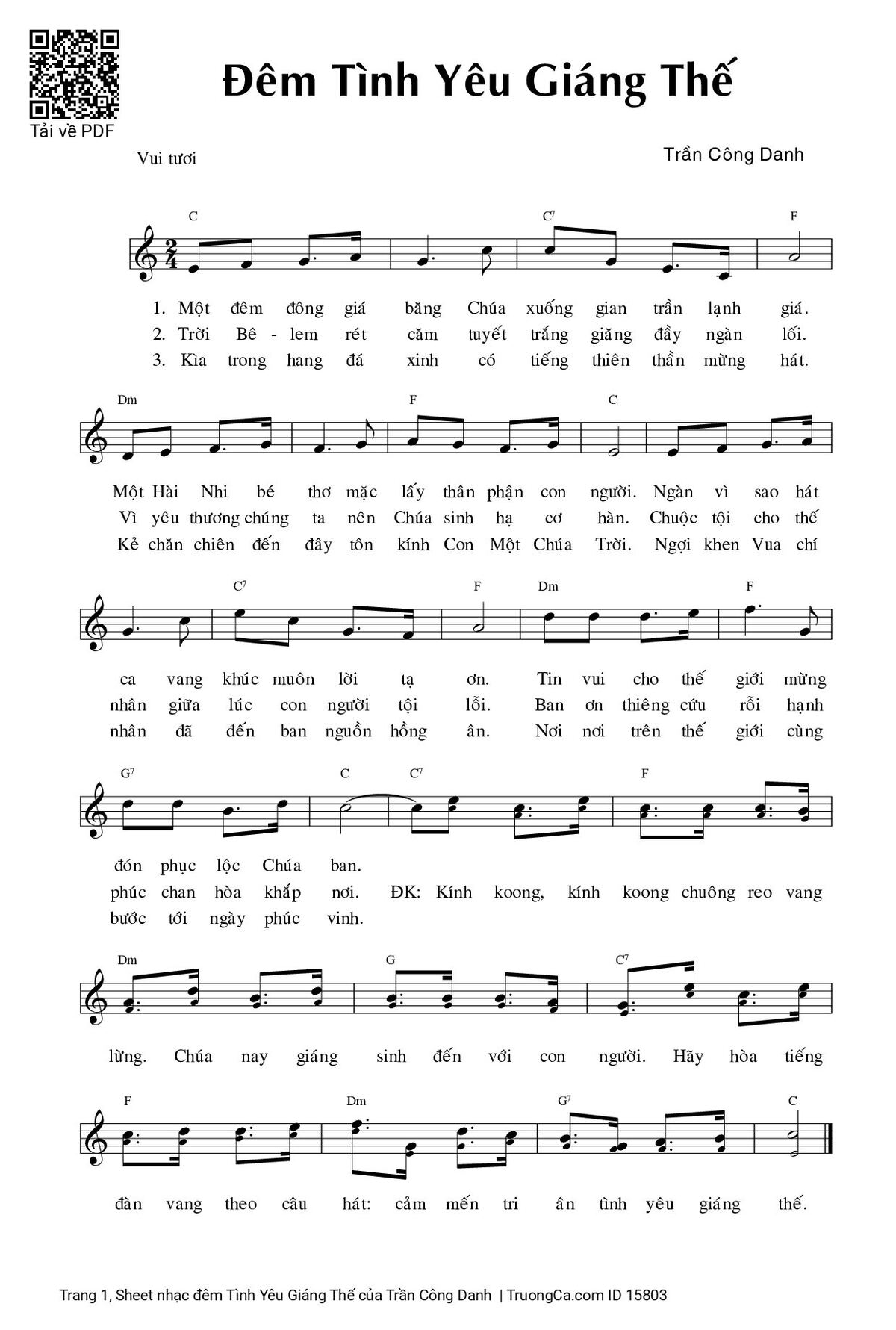 3. Kìa trong hang đá xinh có tiếng Thiên Thần mừng hát. Kẻ chăn chiên đến đây tôn kính Con Một Chúa Trời. Ngợi khen Vua chí nhân đã đến ban nguồn hồng ân. Nơi nơi trên thế giới cùng bước tới ngày phúc vinh.