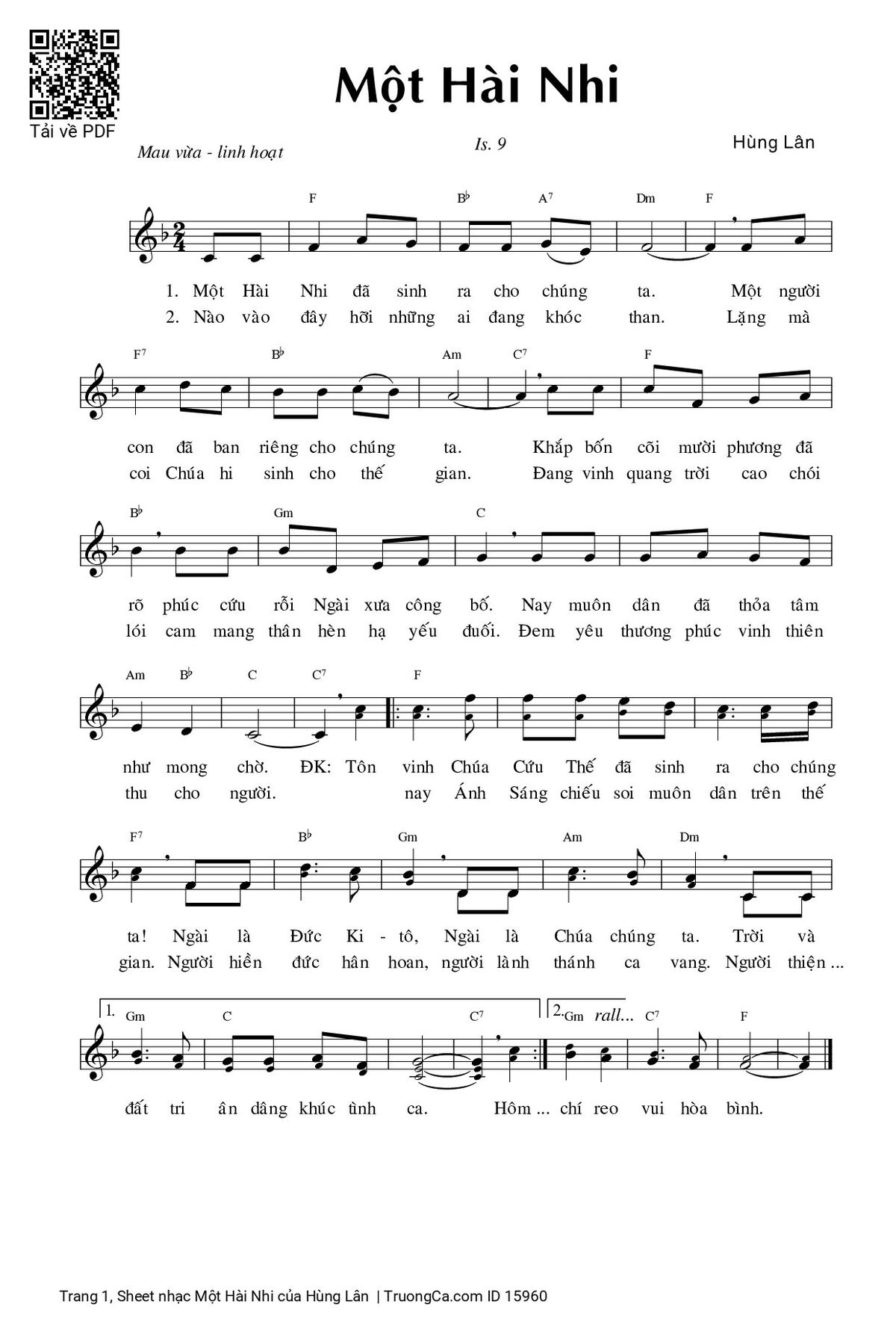 1.Một Hài Nhi đã sinh ra cho chúng ta. Một người con đã ban riêng cho chúng ta. Khắp bốn cõi mười phương đã rỏ phúc cứu rỗi ngày xưa công bố. Nay muôn dân đã thỏa tâm như mong chờ.