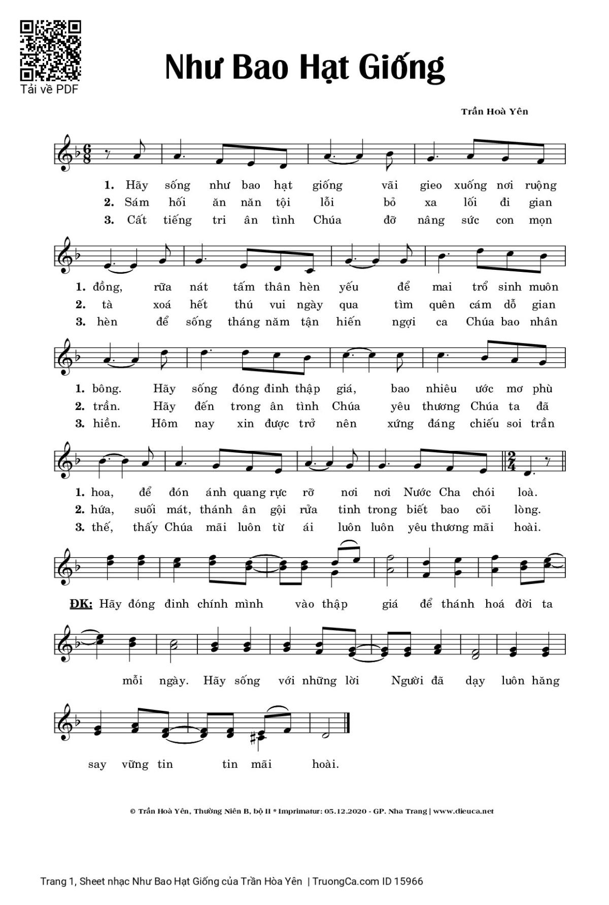 1. Hãy sống như bao hạt giống vãi gieo xuống nơi ruộng đồng, rữa nát tấm thân hèn yếu để mai trổ sinh muôn bông. Hãy sống đóng đinh thập giá, bao nhiêu ước mơ phù hoa, để đón ánh quang rực rỡ nơi nơi Nước Cha chói lòa.