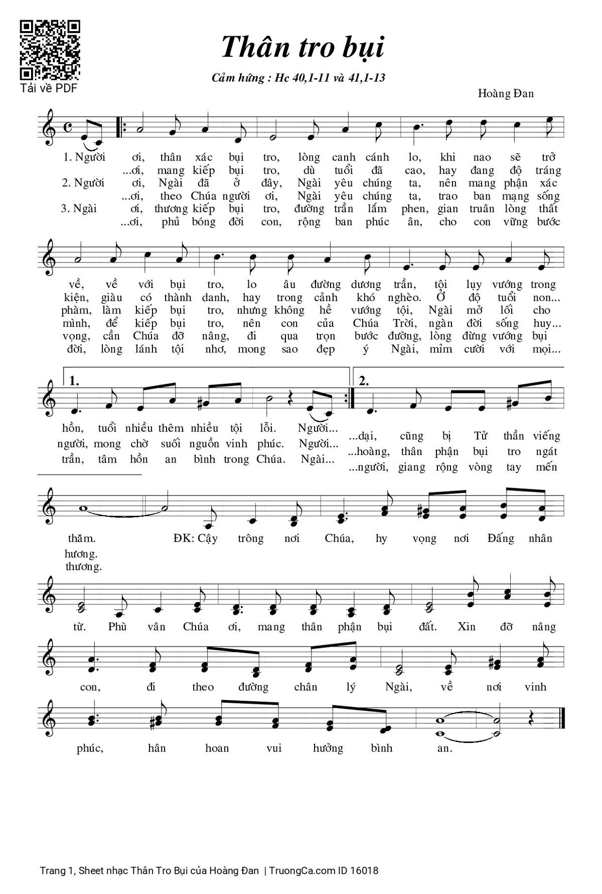 1. Người ơi thân xác bụi tro, lòng canh cánh lo, khi nao sẽ trở về, về với bụi tro, lo âu đường dương trần, tội lụy vướng trong hồn, tuổi nhiều thêm nhiều tội lỗi. Người ơi mang kiếp bụi tro, dù tuổi đã cao, hay đang độ tráng kiện, giàu có thành danh, hay trong cảnh khó nghèo. Ở độ tuổi non dại, cũng bị Tử thần viếng thăm.