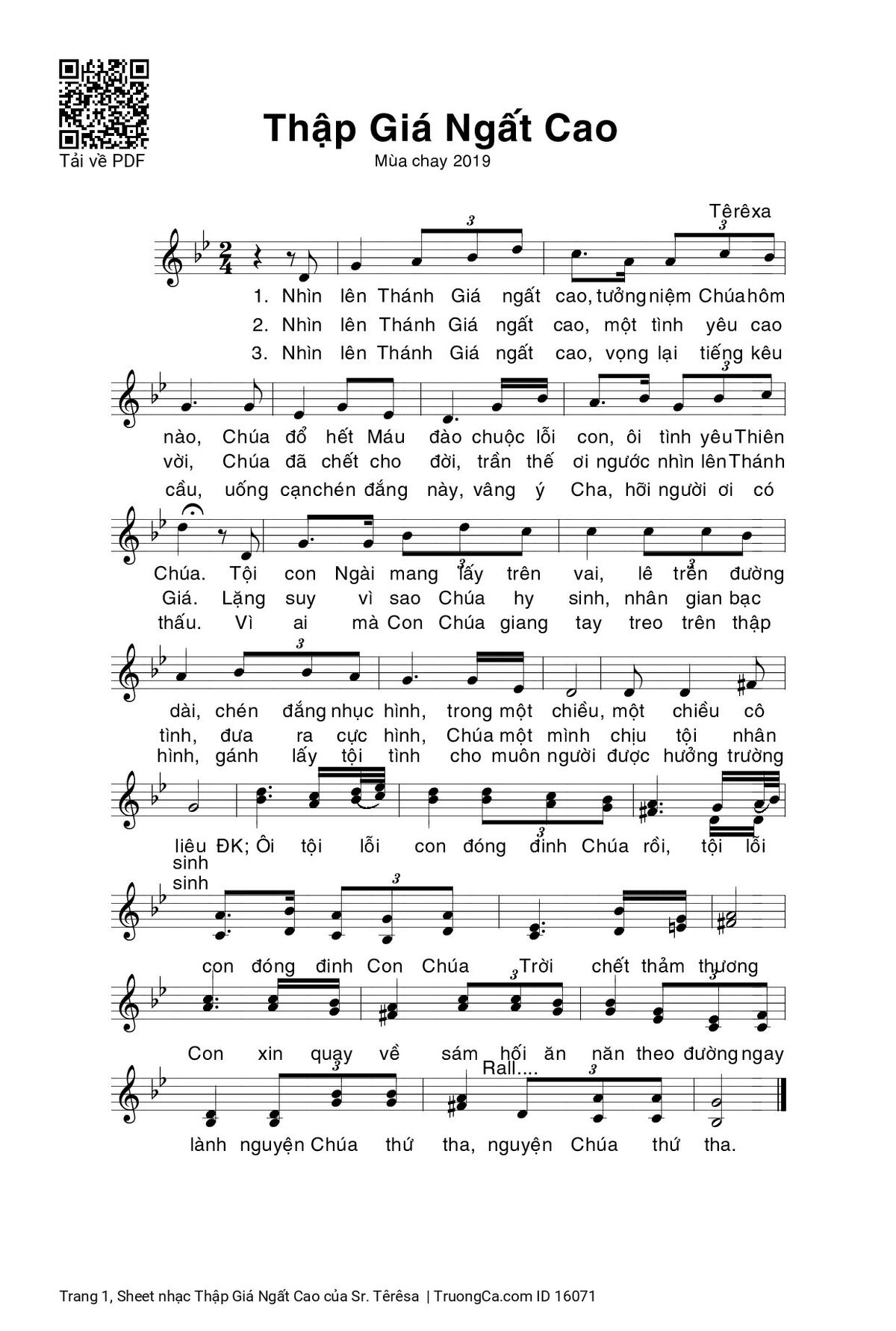 3. Nhìn lên Thánh Giá ngất cao, vọng lại tiếng kêu cầu, uống cạn chén đắng này, vâng ý Cha, hỡi người ơi có thấu. Vì ai mà Con Chúa giang tay treo trên thập hình, gánh lấy tội tình cho muôn người được hưởng trường sinh.