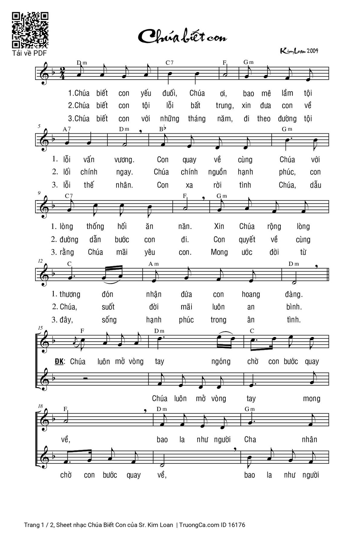 1/ Chúa biết con yếu đuối Chúa ơi, bao mê lầm tội lỗi vấn vương. Con quay về cùng Chúa với lòng thống hối ăn năn. Xin Chúa rộng lòng thương đón nhận đứa con hoang đàng