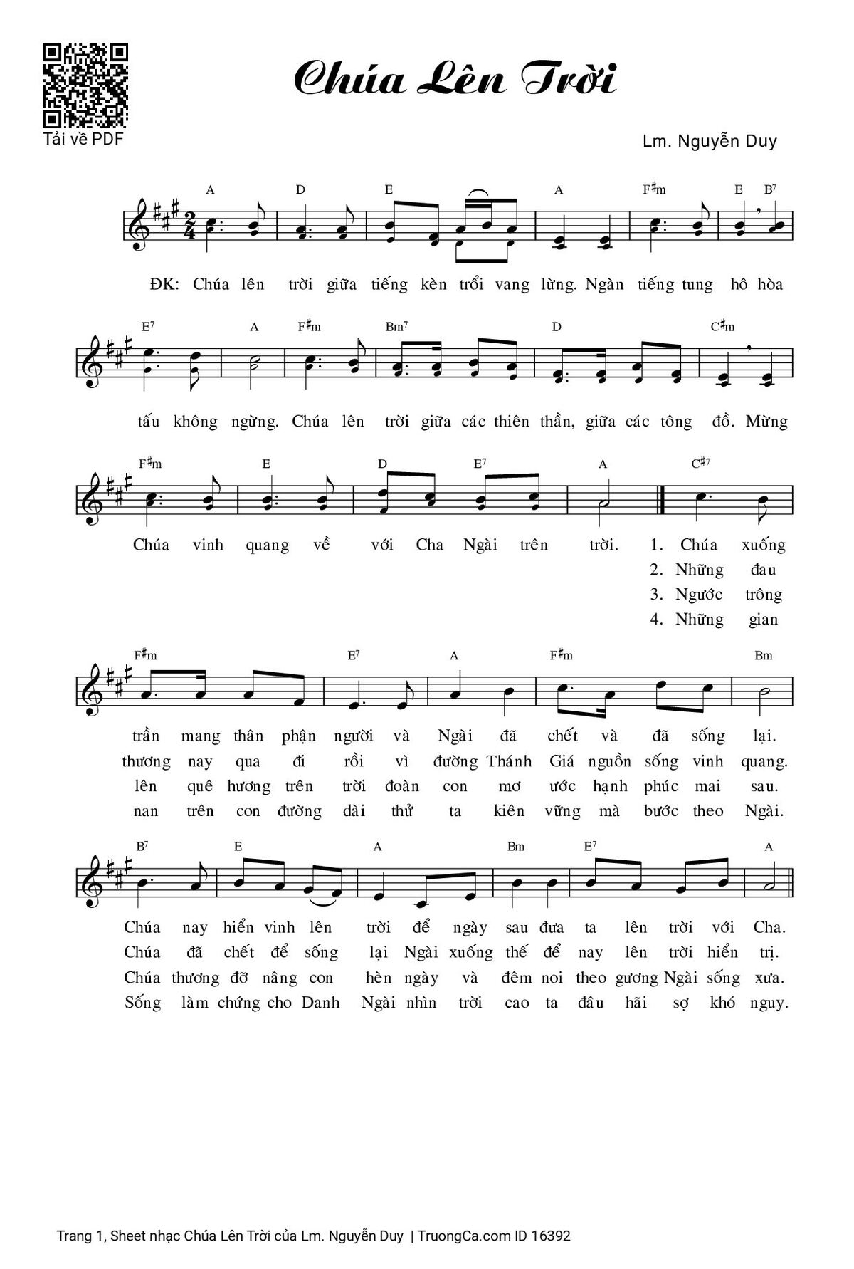 Điệp khúc: Chúa lên trời giữa tiếng kèn trổi vang lừng. Ngàn tiếng tung hô hoà tấu không ngừng. Chúa lên trời giữa các thiên thần, giữa các tông đồ. Mừng Chúa vinh quang về với Cha Ngài trên trời.