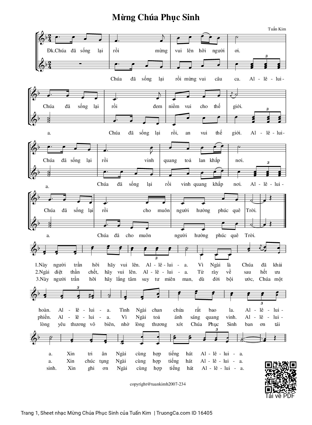 Điệp khúc. Chúa đã sống lại rồi mừng vui lên hỡi người ơi. Chúa đã sống lại rồi đem niềm vui cho thế giới. Chúa đã sống lại rồi vinh quang tỏa lan khắp nơi. Chúa đã sống lại rồi cho muôn người hưởng phúc Quê Trời.