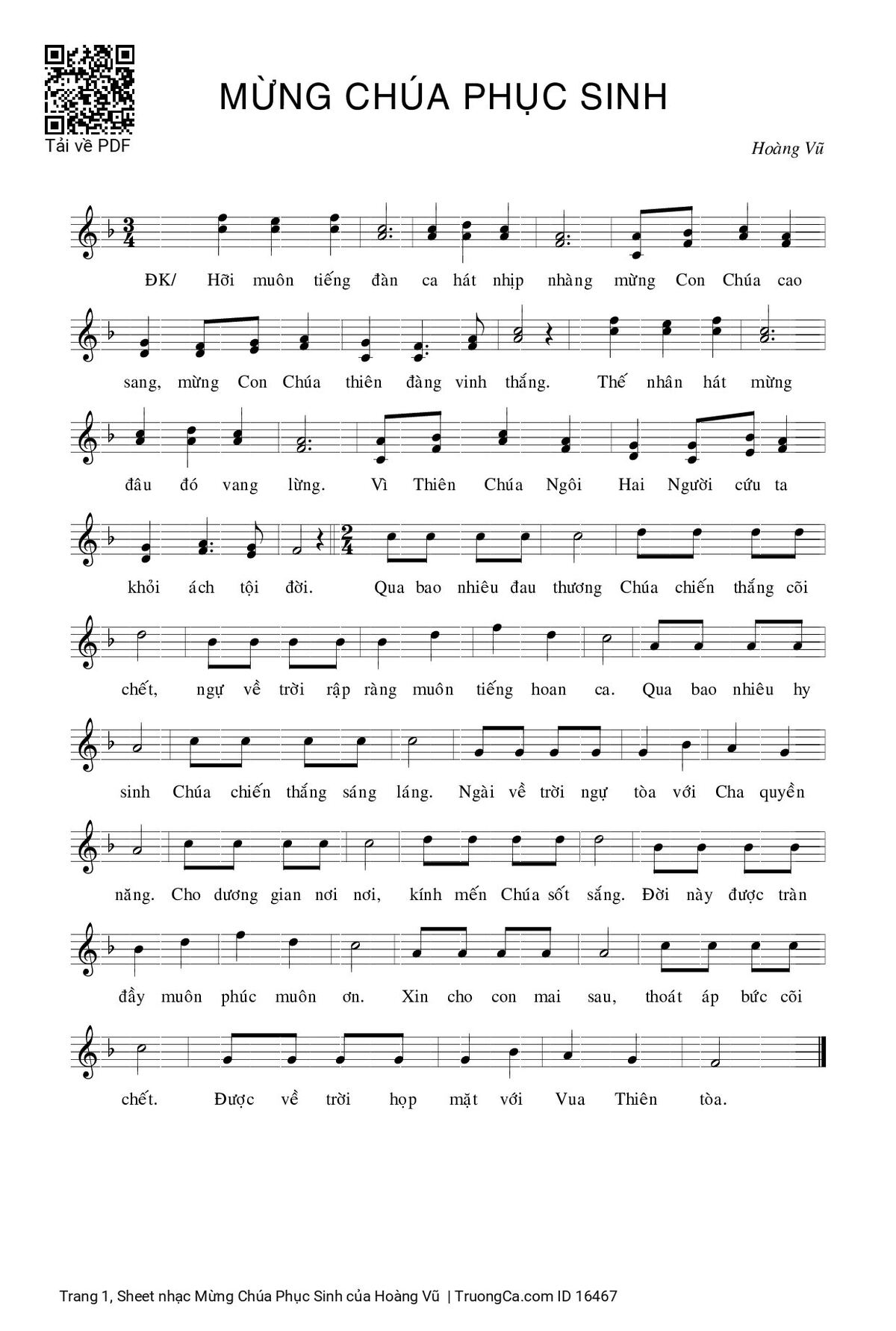 Điệp khúc. Hỡi muôn tiếng đàn ca hát nhịp nhàng mừng Con Chúa cao sang, mừng Con Chúa thiên đàng vinh thắng. Thế nhân hát mừng, đâu đó vang lừng. Vì Thiên Chúa Ngôi Hai Người cứu ta khỏi ách tội đời.