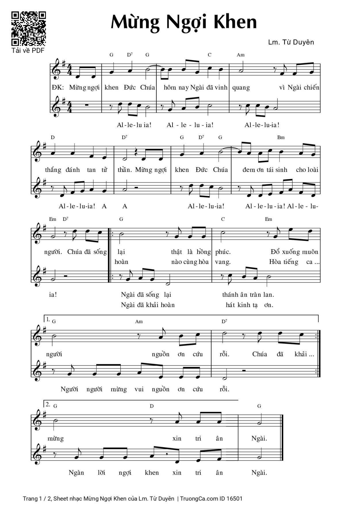 Điệp khúc: Mừng ngợi khen Đức Chúa hôm nay Ngài đã vinh quang, Vì Ngài Chiến thắng đánh tan tử thần. Mừng ngợi khen Đức Chúa đem ơn tái sinh cho loài người.Chúa đã sống lại thật là hồng phúc. Đổ xuống muôn người nguồn ơn cứu rỗi, Chúa đã khải hoàn nào cùng hòa vang hòa tiếng ca mừng xin tri ân Ngài.