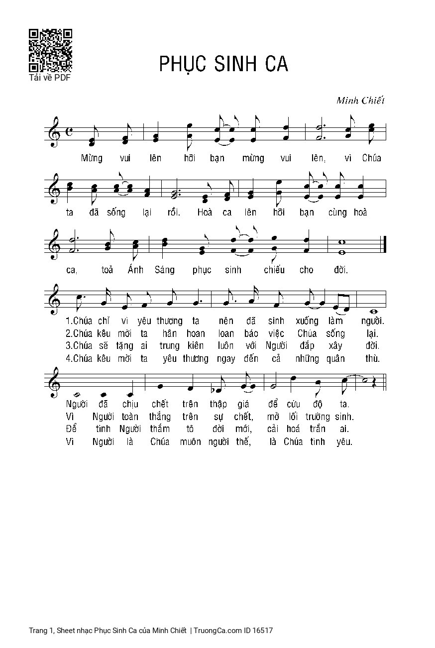 Điệp khúc: Mừng vui lên hỡi bạn mừng vui lên, vì Chúa ta đã sống lại rồi. Hoà ca lên hỡi bạn cùng hoà ca, toả Ánh Sáng phục sinh chiếu cho đời.