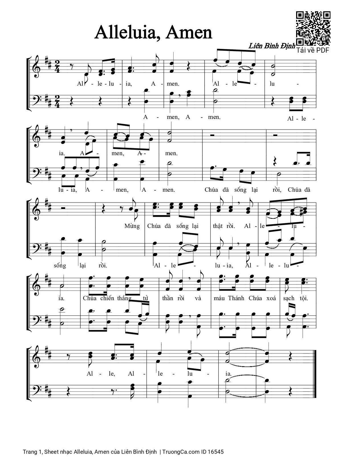 Alleluia, Amen! Alleluia, Amen, Amen! Mừng Chúa đã sống lại thật rồi. Alleluia! Chúa chiến thắng tử thần rồi và Máu Thánh xoá sạch tội. Alle, Alleluia!
