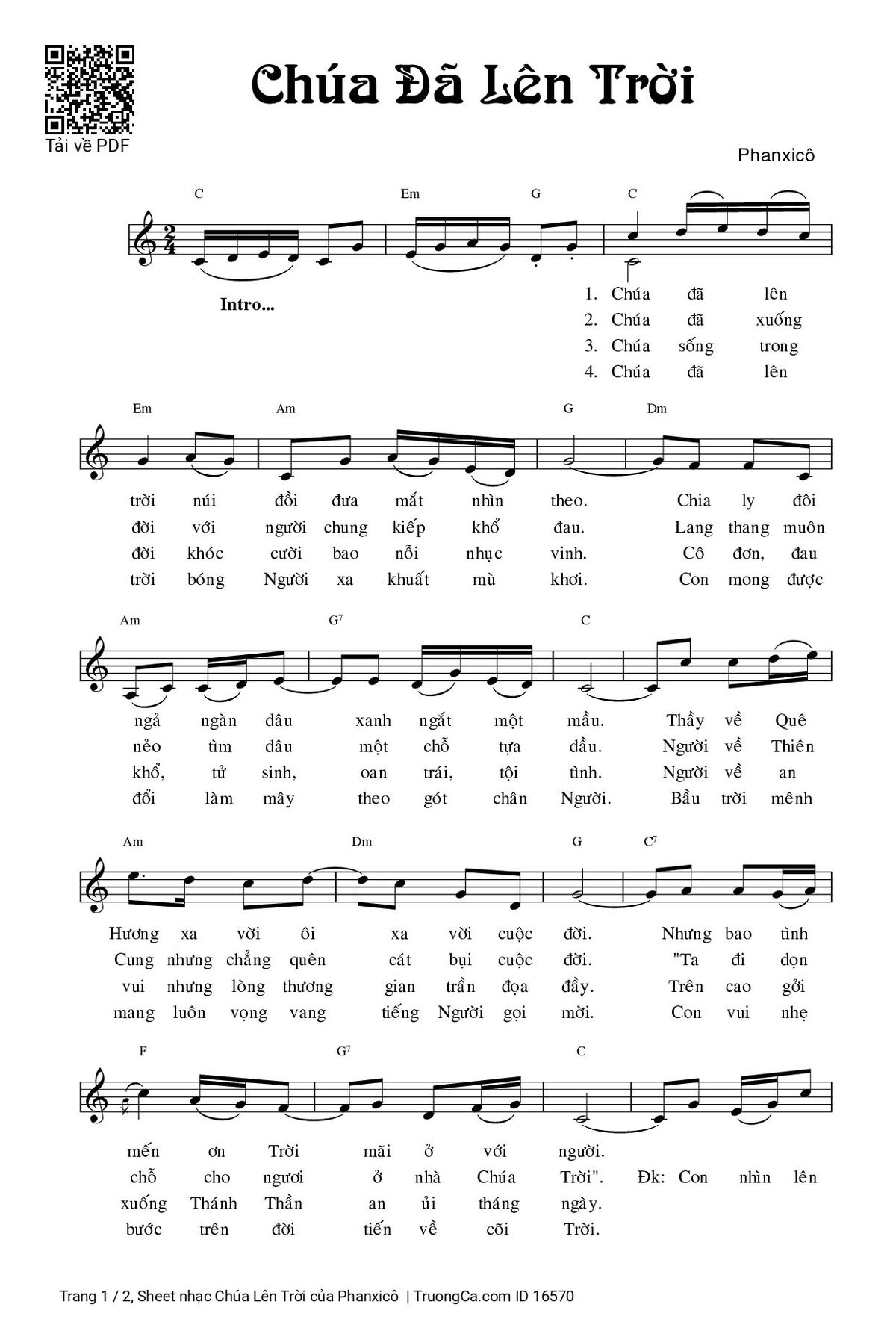 Transposition is the process of moving a song's melody and chords up or down in pitch by a constant interval. The direction of the transposition tool is indicated by a plus (+) sign for up and a minus (-) sign for down. Hover mouse over chords signs to see the chords chart of Chúa Lên Trời song.