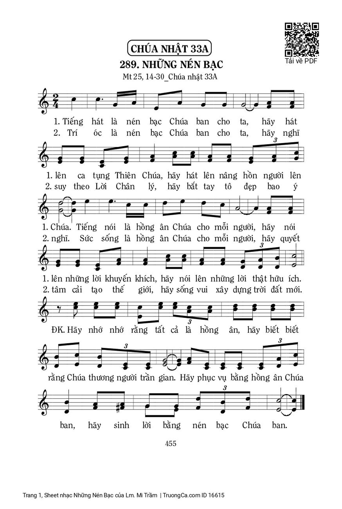Điệp khúc: Hãy nhớ nhớ rằng tất cả là hồng ân, hãy biết biết rằng Chúa thương người trần gian. Hãy phục vụ bằng hồng ân Chúa ban, hãy sinh lời bằng nén bạc Chúa ban.