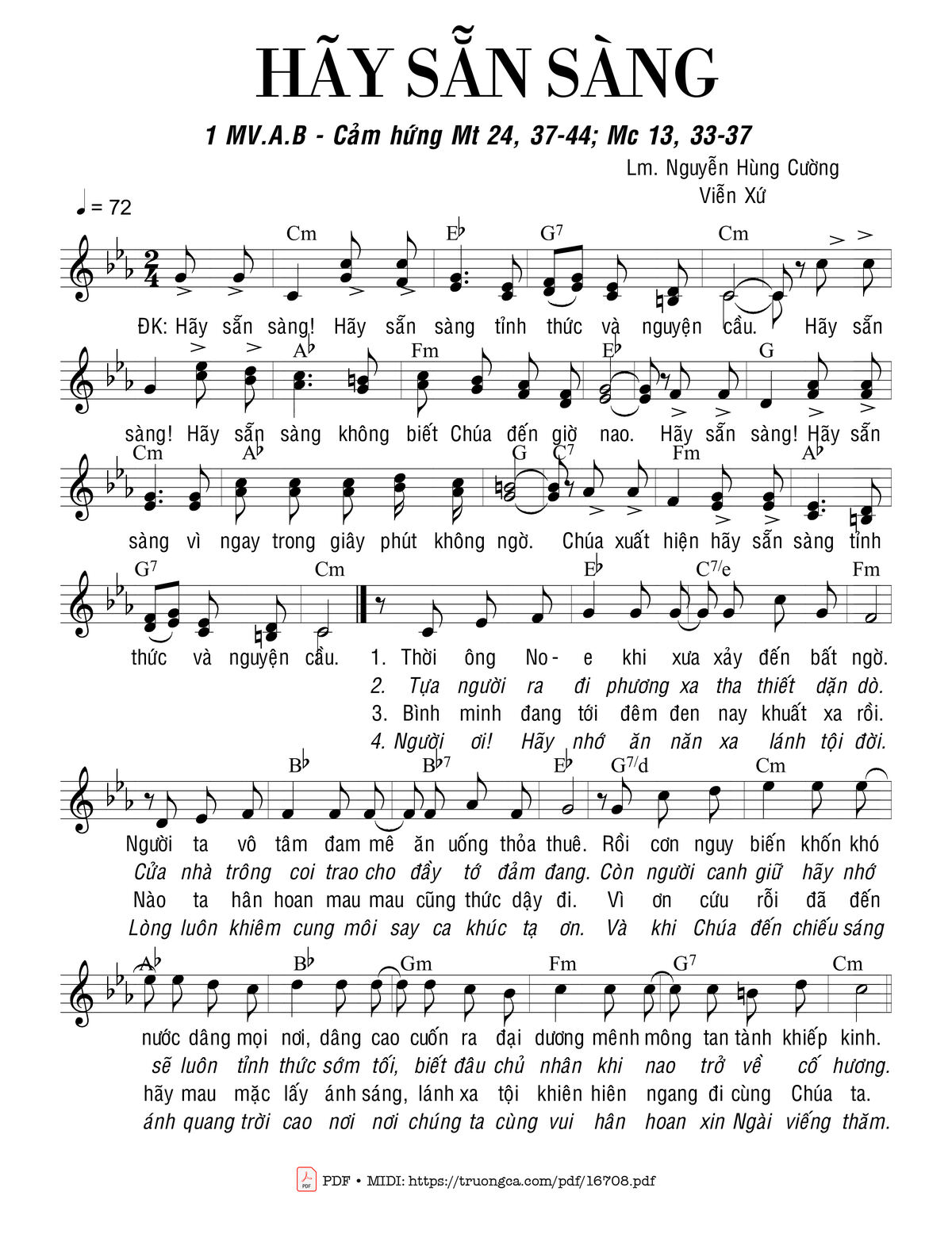 Điệp khúc. Hãy sẵn sàng, hãy sẵn sàng tỉnh thức và nguyện cầu. Hãy sẵn sàng, hãy sẵn sàng không biết Chúa đến giờ nao. Hãy sẵn sàng, hãy sẵn sàng vì ngay trong giây phút không ngờ. Chúa xuất hiện hãy sẵn sàng tỉnh thức và nguyện cầu.