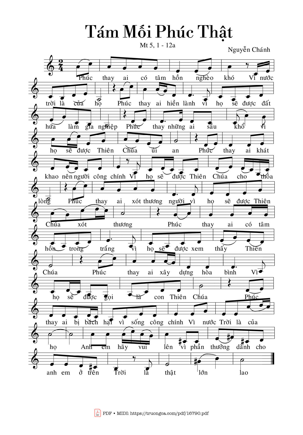 Phúc thay ai có tâm hồn nghèo khó vì Nước Trời là của họ. Phúc thay ai hiền lành vì họ sẽ được đất hứa làm gia nghiệp. Phúc thay những ai sầu khổ vì họ sẽ được Thiên Chúa ủi an. Phúc thay ai khát khao nên người công chính vì họ sẽ được Thiên Chúa cho thỏa lòng. Phúc thay ai xót thương người vì họ sẽ được Thiên Chúa xót thương. . Phúc thay ai có tâm hồn trong trắng vì họ sẽ được xem thấy Thiên Chúa. Phúc thay ai xây dựng hòa bình vì họ sẽ được gọi là con Thiên Chúa. Phúc thay ai bị bách hại vì sống công chính vì Nước Trời là của họ. Anh em hãy vui lên vì phần thưởng dành cho anh em ở trên Trời là thật lớn lao.
