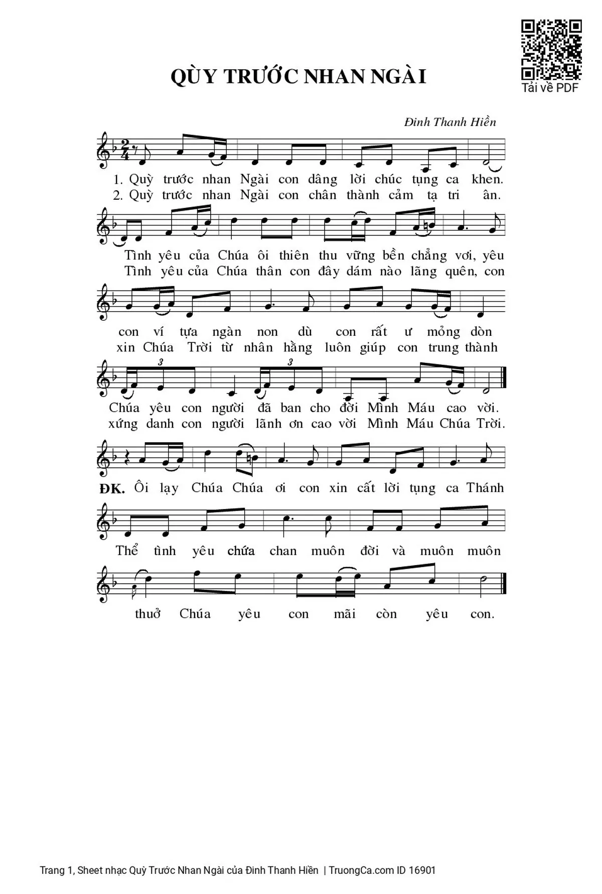 The first sentence: QUỲ TRƯỚC NHAN NGÀI Đinh Thanh Hiền Quỳ trước nhan Ngài con dâng lời chúc tụng ca khen