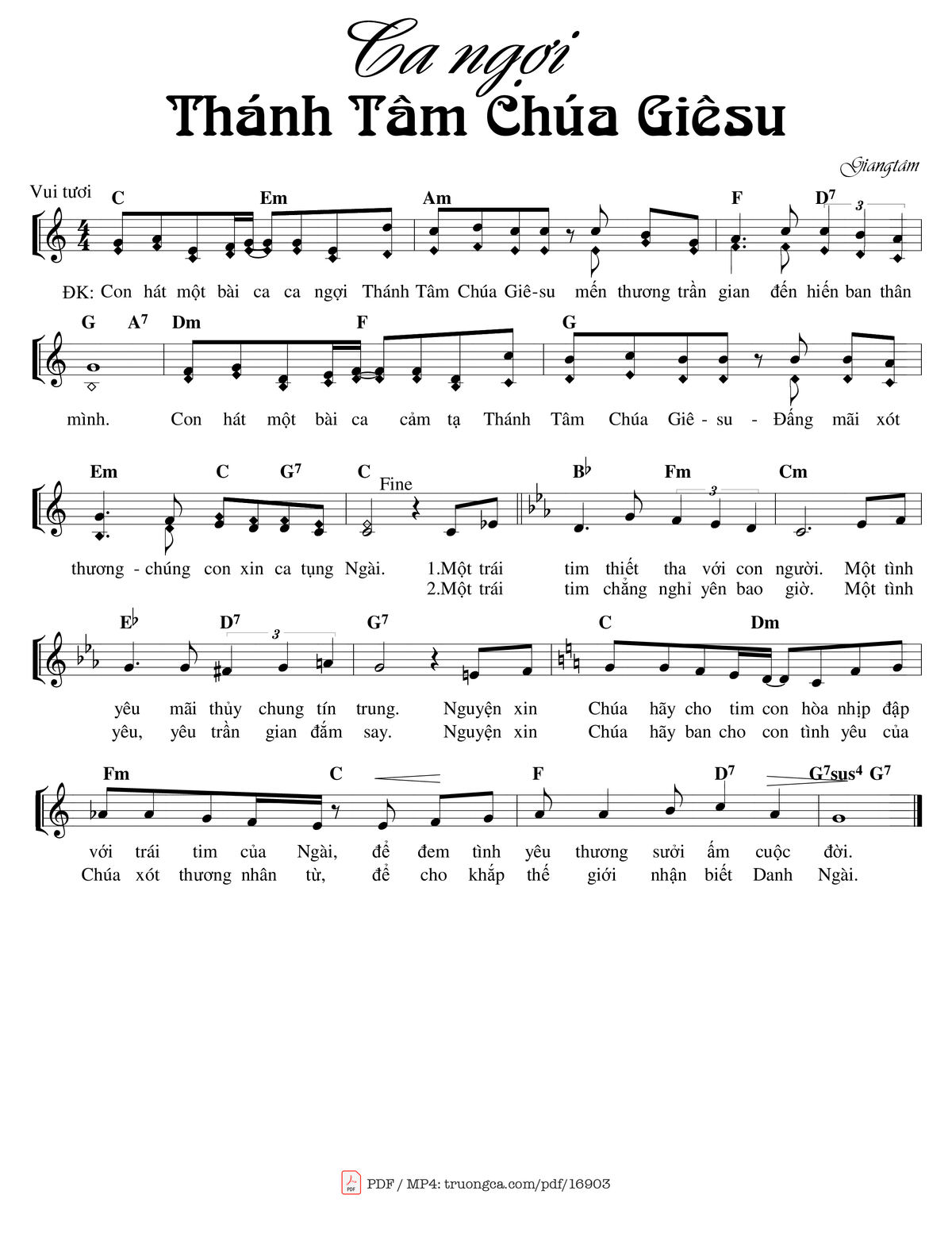 Transposition is the process of moving a song's melody and chords up or down in pitch by a constant interval. The direction of the transposition tool is indicated by a plus (+) sign for up and a minus (-) sign for down. Hover mouse over chords signs to see the chords chart of Ca Ngợi Thánh Tâm Chúa Giêsu song.