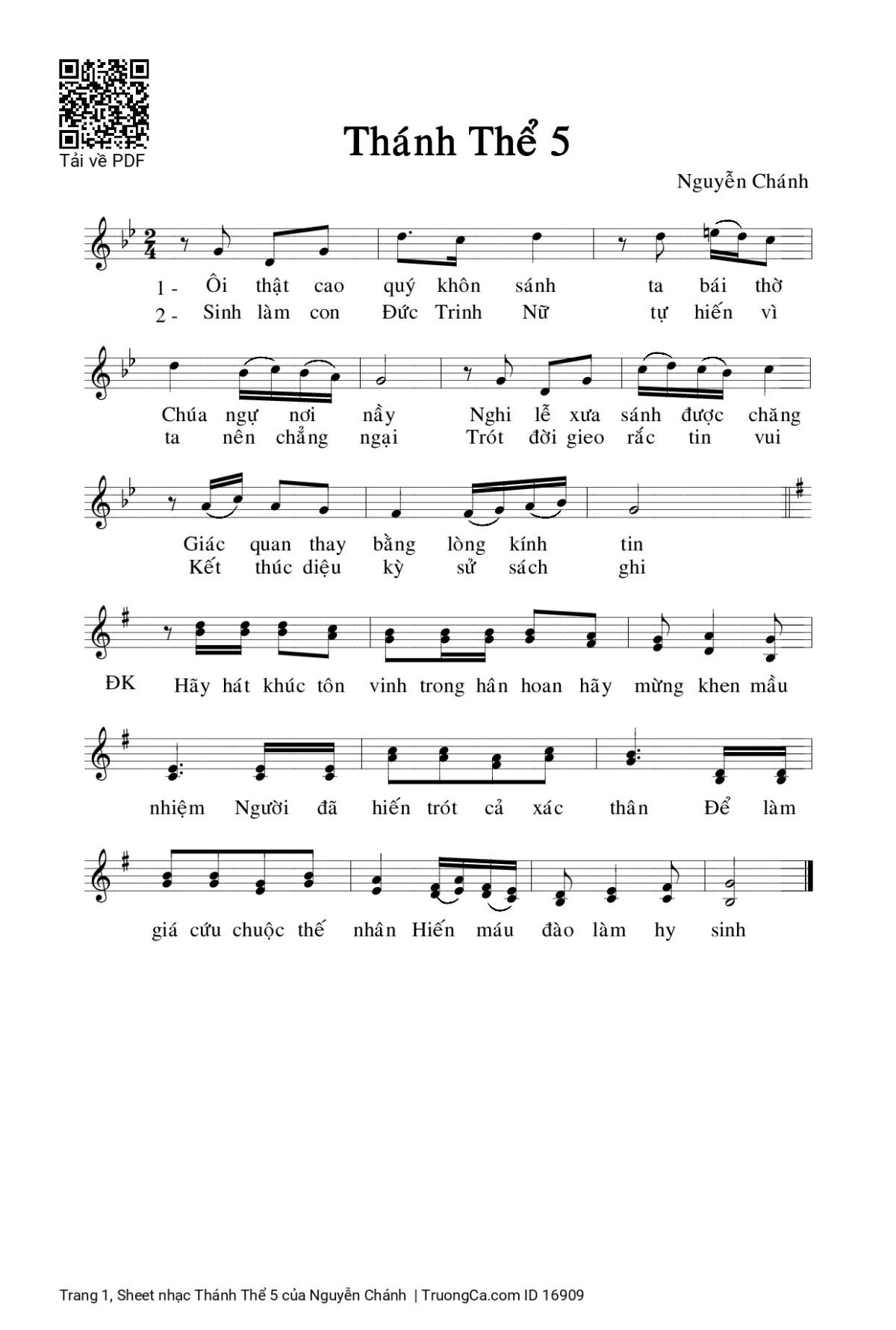 Transposition is the process of moving a song's melody and chords up or down in pitch by a constant interval. The direction of the transposition tool is indicated by a plus (+) sign for up and a minus (-) sign for down. Hover mouse over chords signs to see the chords chart of Thánh Thể 5 song.