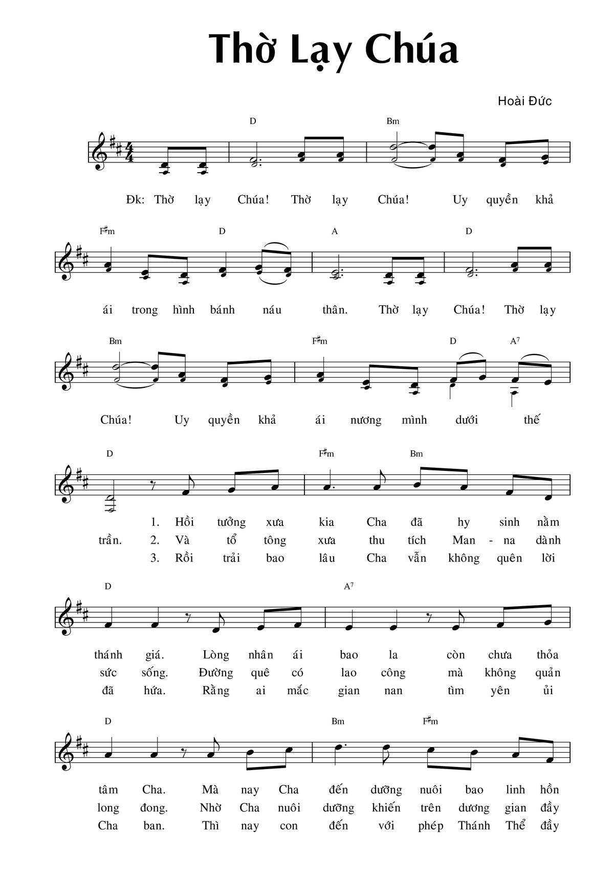 Điệp khúc: Thờ lạy Chúa! Thờ lạy Chúa! Uy quyền khả ái trong hình bánh náu thân. Thờ lạy Chúa! Thờ lạy Chúa! Uy quyền khả ái nương mình dưới thế trần.